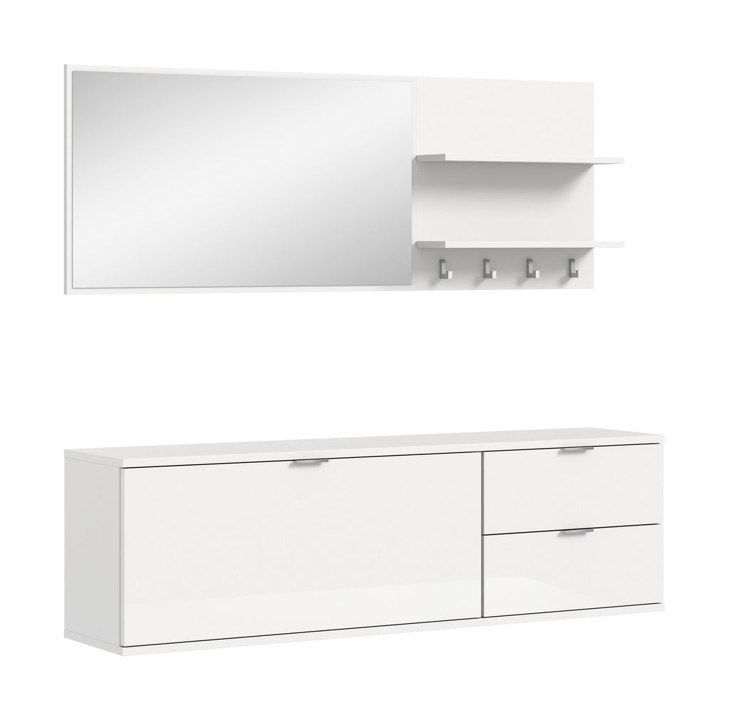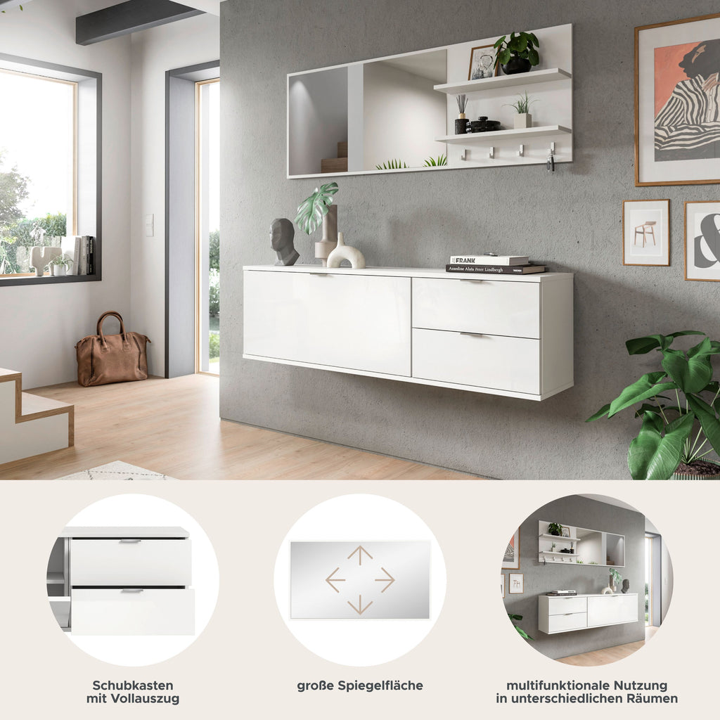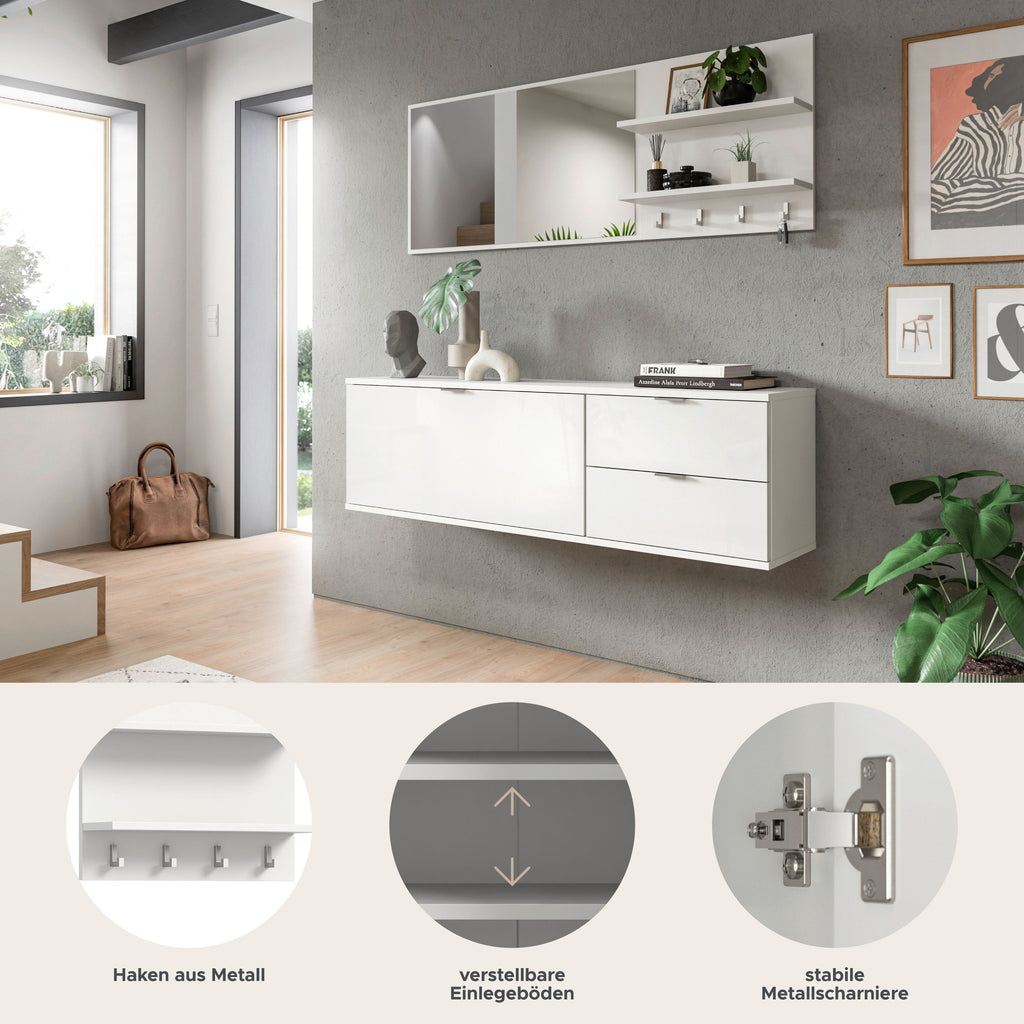 Bringen Sie frischen Wind in Ihren Eingangsbereich mit unserer eleganten Garderobenkombination (B/H/T: 144x191x37 cm) in strahlendem Weiß Hochglanz. Dieses durchdachte Set vereint modernes Design mit praktischen Lösungen und ist perfekt für kleine bis mittlere Flure. Die Kombination umfasst einen großen Spiegel, der den Raum optisch weitet und Ihnen einen letzten Blick vor dem Verlassen des Hauses ermöglicht. Die beiden Sitzbänke/Kommoden bieten nicht nur einen bequemen Platz zum Anziehen, sondern auch cleveren Stauraum für Schuhe und Accessoires. Das integrierte Paneel mit Haken sorgt dafür, dass Jacken und Taschen immer griffbereit sind und Ihren Flur ordentlich erscheinen lassen. Diese Garderobenkombination ist ideal für alle, die Wert auf Stil und Funktionalität legen. Verwandeln Sie Ihren Flur in einen einladenden Raum, der Ordnung und Eleganz ausstrahlt. Gönnen Sie sich diese moderne Garderobenkombination und genießen Sie einen stylishen Eingangsbereich, der seine Gäste begeistert!