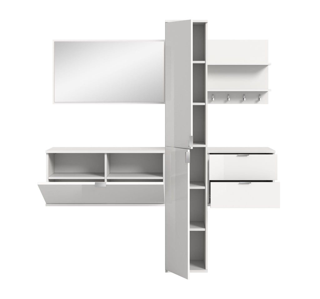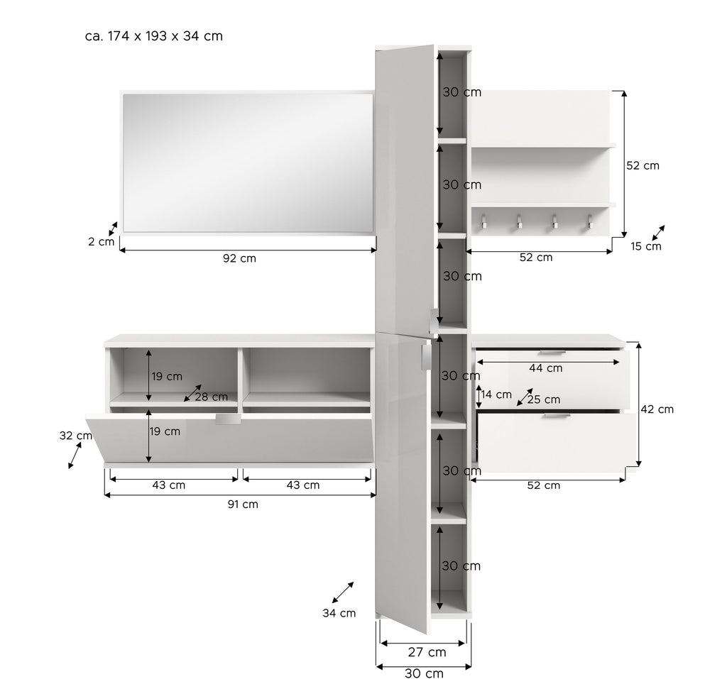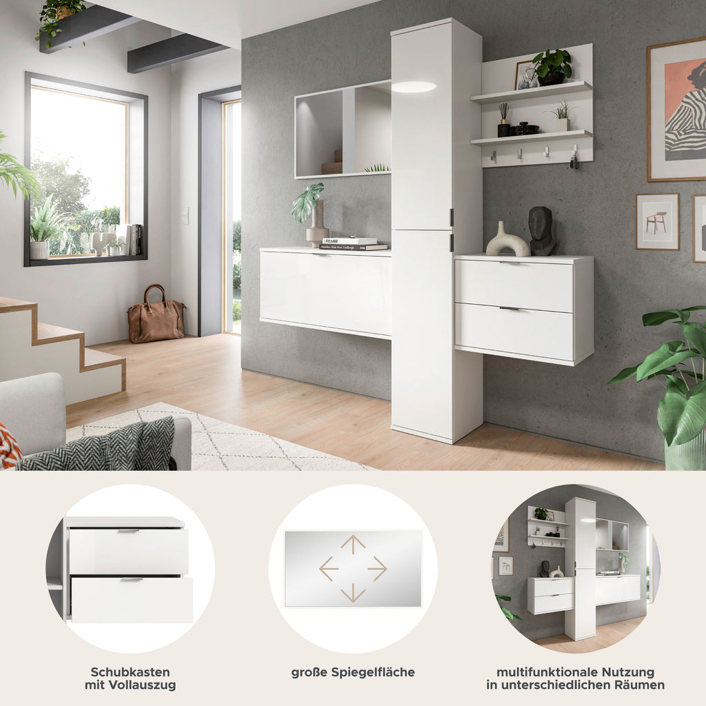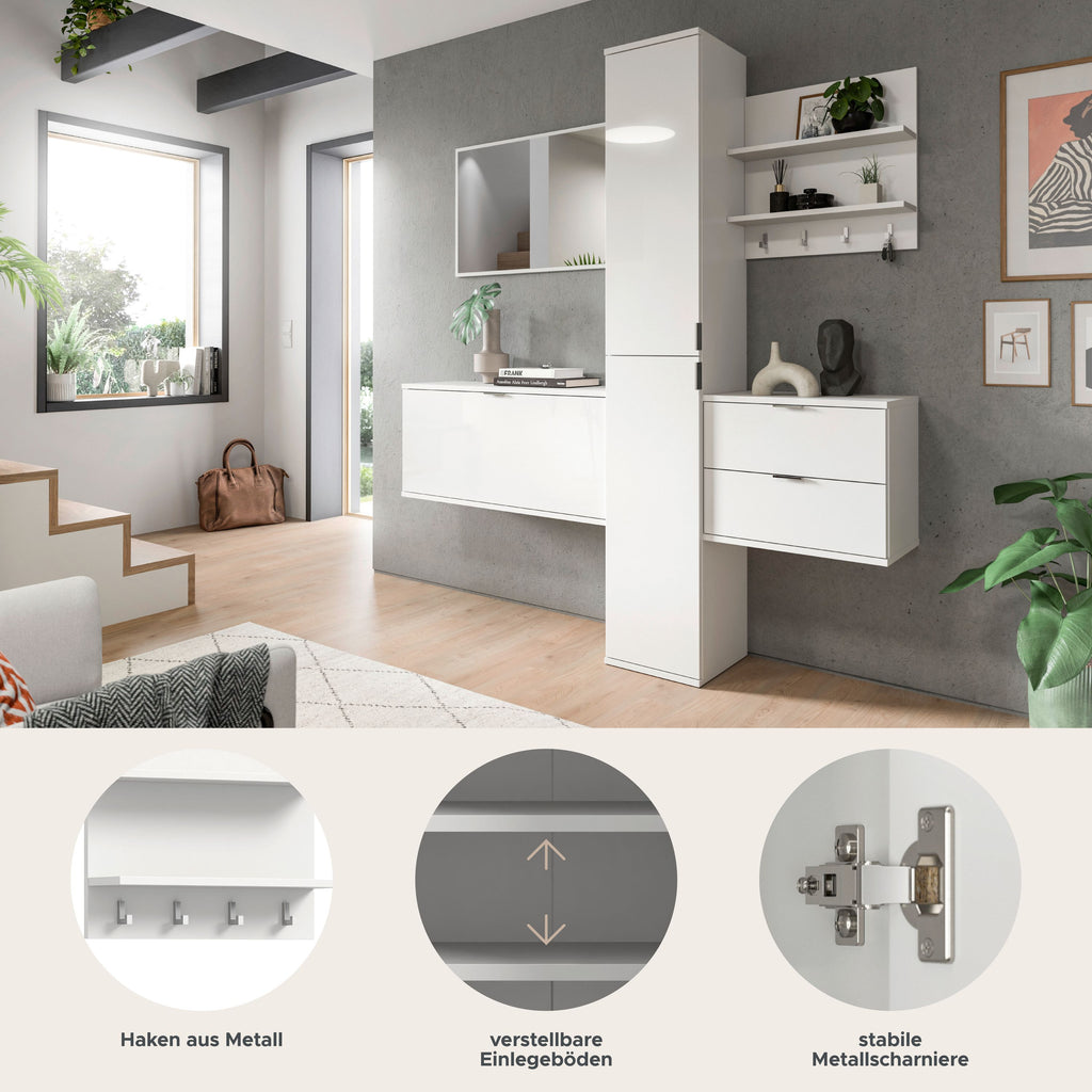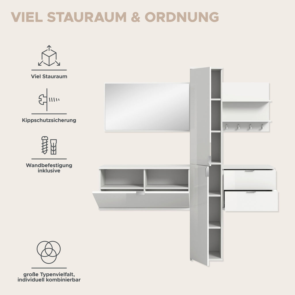 Entdecken Sie unsere beeindruckende Garderobenkombination (B/H/T: 174x191x37 cm) in elegantem Weiß Hochglanz. Sie bringt nicht nur einen modernen Look in Ihren Flur, sondern überzeugt auch durch ihre durchdachte Funktionalität. Diese stilvolle Kombination besteht aus einem großen Spiegel, der Ihren Eingangsbereich optisch vergrößert, sowie einer praktischen Sitzbank, die gleichzeitig als Kommode dient – perfekt für Ihre Sachen. Der vielseitige Hochschrank bietet zusätzlichen Stauraum für Jacken, Schuhe und Accessoires. Das schicke Paneel rundet das Ensemble ab und sorgt dafür, dass Sie alles Nötige zur Hand haben, während es Ihren Flur aufwertet. Ob beim Eintreten oder Verlassen des Hauses, diese Garderobenkombination vereint Ordnung und Stil. Perfekt für alle, die einen modernen, minimalistischen Wohnstil schätzen oder einfach nur eine praktische Lösung für ihren Flur suchen. Holen Sie sich diese Garderobenkombination und verwandeln Sie Ihren Eingangsbereich in einen einladenden Raum!