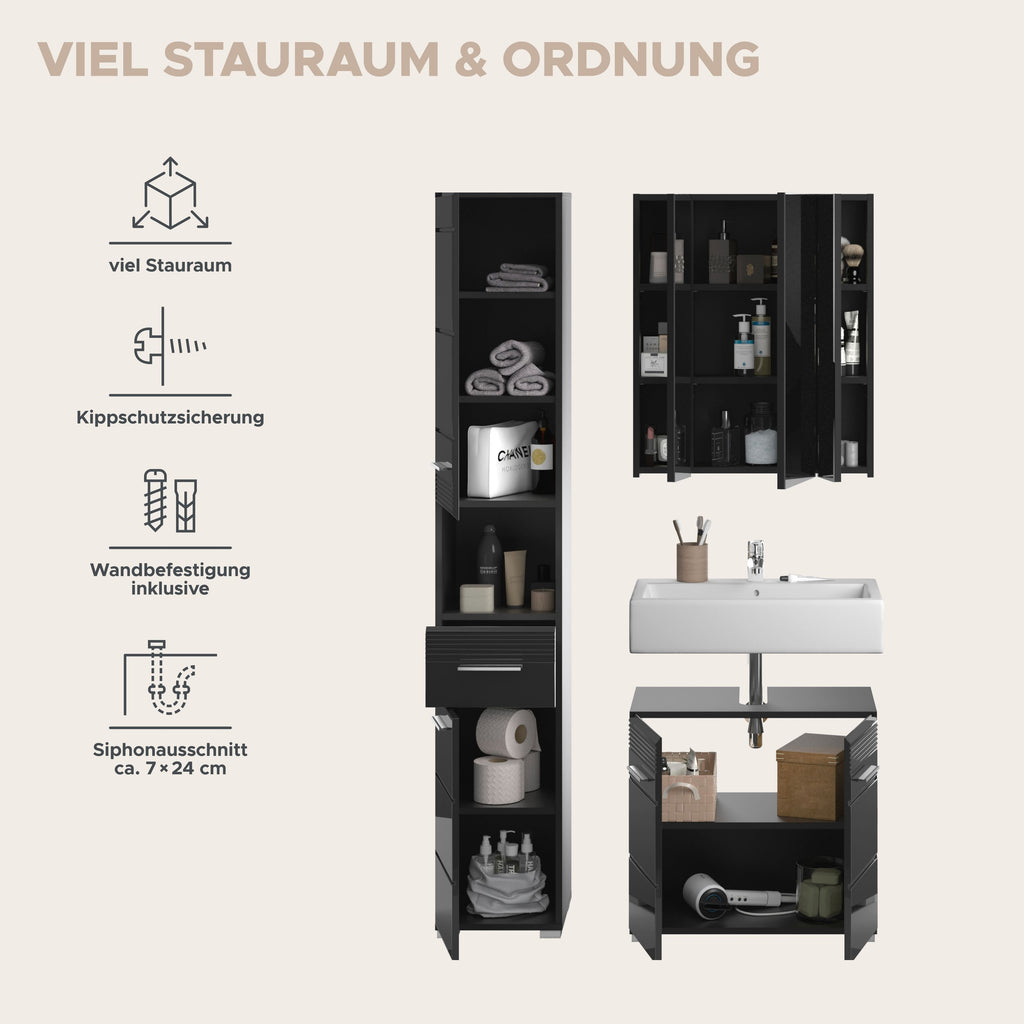 Tauchen Sie ein in die Vielseitigkeit unserer Badkombination für Badezimmer und Hauswirtschaftsraum. Diese Kombination aus Schwarz-Nachbildung und Schwarz-Hochglanz tiefzieh bietet nicht nur ausreichend Stauraum, sondern auch ein modernes Design, das Ihr Zuhause bereichert. Ihre hochwertige Verarbeitung und praktische Funktionalität machen sie zu einem unverzichtbaren Element für jedes Bad.