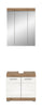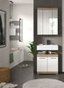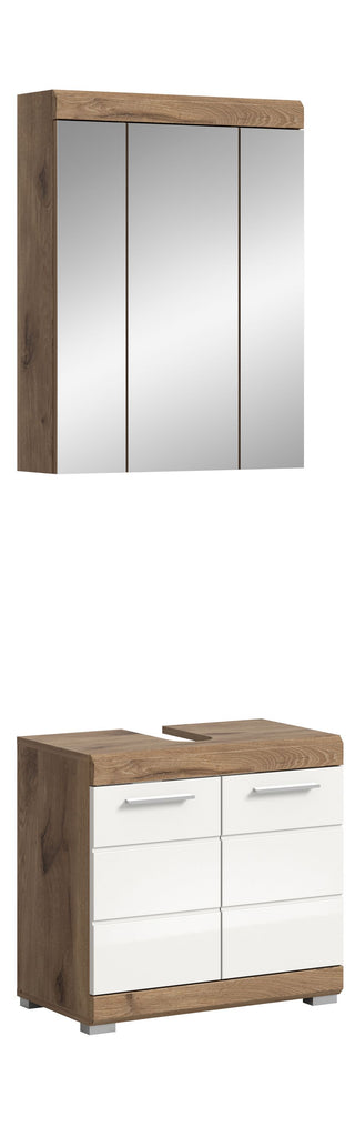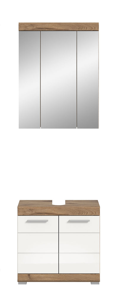 Diese stilvolle Badkombination kombiniert modernes Design mit praktischer Funktionalität. Mit den Maßen 60x191x34 cm bietet sie eine platzsparende Lösung für kleinere Badezimmer, ohne dabei auf Stauraum zu verzichten. Die elegante Kombination aus weißem Hochglanz und Nox Oak Nachbildung verleiht Ihrem Badezimmer ein zeitgemäßes und einladendes Ambiente. Die Kombination verfügt über zwei Türen und drei Spiegeltüren, die nicht nur Ihre Utensilien optimal verstauen, sondern auch eine praktische Spiegeloberfläche für Ihre tägliche Routine bieten. Das Design sorgt für eine klare Linienführung und einen aufgeräumten Look. Gefertigt aus FSC®-zertifiziertem Holzwerkstoff, steht dieses Möbelstück für Nachhaltigkeit und den Schutz der Wälder. Mit dieser Badkombination setzen Sie nicht nur auf hochwertige Qualität, sondern auch auf umweltbewusstes Wohnen. Bereichern Sie Ihr Badezimmer mit dieser modernen Badkombination – eine perfekte Kombination aus Stil, Funktionalität und Umweltbewusstsein.