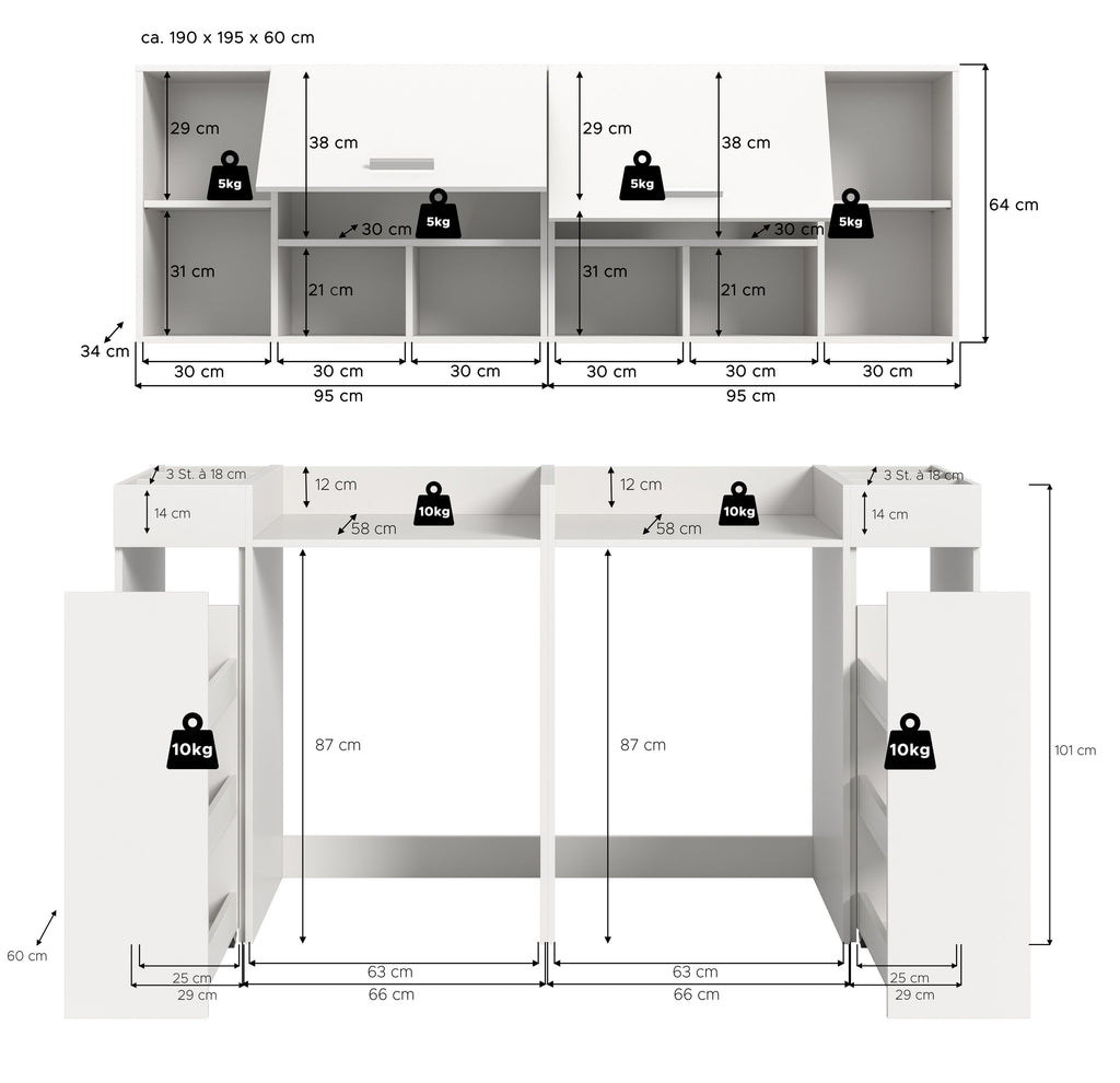 Das großzügige Waschmaschinenumbau Set (B/H/T: 190x195x60 cm) in weiß Nachbildung bietet Ihnen alles für Ihre Waschküche! Mit zwei Waschmaschinenumbauten, zwei Anstellregalen und zwei Hängeschränken in diesem 6-teiligen Set haben Sie ausreichend Stauraum für all Ihre Bedürfnisse. Die moderne Gestaltung sorgt dafür, dass Ihr Raum elegant und ordentlich wirkt. Setzen Sie auf Funktionalität und Stil in Ihrer Waschküche mit dieser umfassenden Lösung! Perfekt für die Nutzung im Hauswirtschaftsraum.