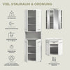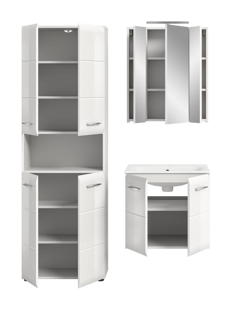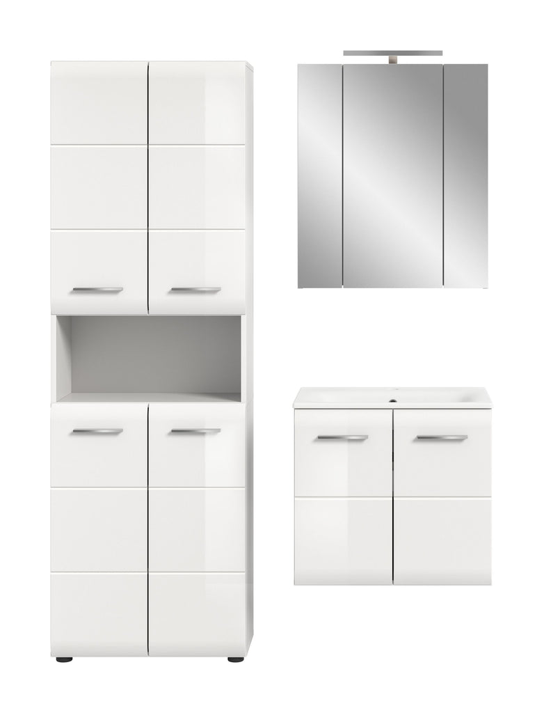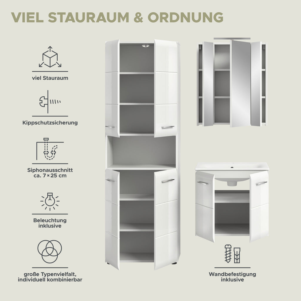 Gestalten Sie Ihr Badezimmer mit unserer eleganten 3-teiligen Badkombination, bestehend aus einem breiten Hochschrank, einem Waschtisch mit integriertem Waschbecken und einem beleuchteten Spiegelschrank. Mit großzügigen Abmessungen von 135 x 185 x 46 cm und einem Typenabstand von 15 cm bietet diese Kombination nicht nur Stauraum, sondern auch Funktionalität. Die hochwertige MDF-Front mit Rillenfräsung verbindet modernes Design mit praktischer Anwendung für ein stilvolles Badezimmer.