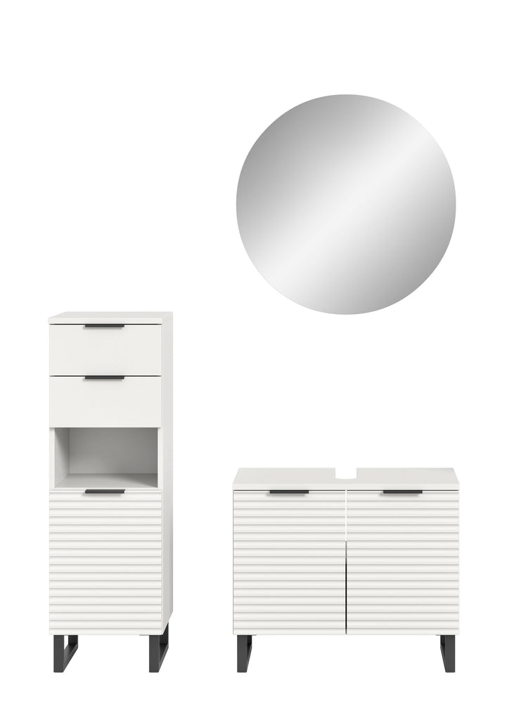 Diese elegante Badkombination in Weiß Nachbildung bringt modernes Design und maximalen Komfort in Ihr Badezimmer. Mit einer Gesamtgröße von 120 cm Breite, 193 cm Höhe und 34 cm Tiefe bietet sie eine perfekt abgestimmte Lösung für jeden Raum, der stilvollen Stauraum und eine harmonische Optik erfordert.Die Kombination umfasst hochwertige Badmöbel in zeitloser Rillenoptik, die dem Raum eine elegante Struktur verleihen. Die feinen Linien und das matte Weiß schaffen ein modernes, stilvolles Erscheinungsbild, das sich nahtlos in jede Badezimmergestaltung einfügt. Der stabile Kufenfuß verleiht den Möbeln nicht nur sicheren Halt, sondern sorgt auch für einen trendigen, schwebenden Look, der Leichtigkeit und Modernität ausstrahlt.Ein Highlight dieser Badkombination ist der runde Spiegelschrank mit indirekter Beleuchtung. Dieser verleiht Ihrem Badezimmer eine besondere Atmosphäre durch sein organisches Design und die sanfte, blendfreie Beleuchtung. Die integrierte Beleuchtung schafft ein angenehmes Licht für die tägliche Pflege und lässt das Bad in einem modernen, warmen Glanz erstrahlen. Gleichzeitig bietet der Spiegelschrank ausreichend Stauraum für Kosmetikartikel und Pflegeprodukte, sodass alles übersichtlich und griffbereit verstaut werden kann.Die funktionalen Elemente der Badkombination bieten reichlich Stauraum, während die hochwertige Verarbeitung und die pflegeleichten Oberflächen für Langlebigkeit und Komfort im Alltag sorgen. Ob Handtücher, Pflegeprodukte oder Reinigungsmittel – in den großzügigen Schränken findet alles seinen Platz.Wenn Sie auf der Suche nach einer stilvollen und funktionalen Badlösung sind, die Design, Komfort und Qualität vereint, ist diese Badkombination in Weiß Nachbildung mit Rillenoptik, Kufenfuß und rundem Spiegelschrank mit indirekter Beleuchtung die ideale Wahl für Ihr modernes Badezimmer.