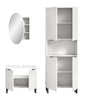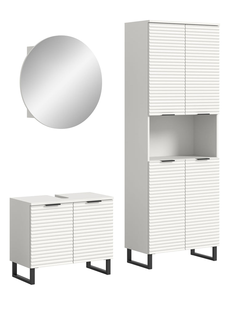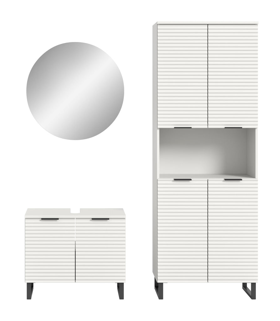 Diese elegante Badkombination in Weiß Nachbildung bringt modernes Design und maximalen Komfort in Ihr Badezimmer. Mit einer Gesamtgröße von 155 cm Breite, 193 cm Höhe und 34 cm Tiefe bietet sie eine perfekt abgestimmte Lösung für jeden Raum, der stilvollen Stauraum und eine harmonische Optik erfordert.Die Kombination umfasst hochwertige Badmöbel in zeitloser Rillenoptik, die dem Raum eine elegante Struktur verleihen. Die feinen Linien und das matte Weiß schaffen ein modernes, stilvolles Erscheinungsbild, das sich nahtlos in jede Badezimmergestaltung einfügt. Der stabile Kufenfuß verleiht den Möbeln nicht nur sicheren Halt, sondern sorgt auch für einen trendigen, schwebenden Look, der Leichtigkeit und Modernität ausstrahlt.Ein Highlight dieser Badkombination ist der runde Spiegelschrank mit indirekter Beleuchtung. Dieser verleiht Ihrem Badezimmer eine besondere Atmosphäre durch sein organisches Design und die sanfte, blendfreie Beleuchtung. Die integrierte Beleuchtung schafft ein angenehmes Licht für die tägliche Pflege und lässt das Bad in einem modernen, warmen Glanz erstrahlen. Gleichzeitig bietet der Spiegelschrank ausreichend Stauraum für Kosmetikartikel und Pflegeprodukte, sodass alles übersichtlich und griffbereit verstaut werden kann.Die funktionalen Elemente der Badkombination bieten reichlich Stauraum, während die hochwertige Verarbeitung und die pflegeleichten Oberflächen für Langlebigkeit und Komfort im Alltag sorgen. Ob Handtücher, Pflegeprodukte oder Reinigungsmittel – in den großzügigen Schränken findet alles seinen Platz.Wenn Sie auf der Suche nach einer stilvollen und funktionalen Badlösung sind, die Design, Komfort und Qualität vereint, ist diese Badkombination in Weiß Nachbildung mit Rillenoptik, Kufenfuß und rundem Spiegelschrank mit indirekter Beleuchtung die ideale Wahl für Ihr modernes Badezimmer.