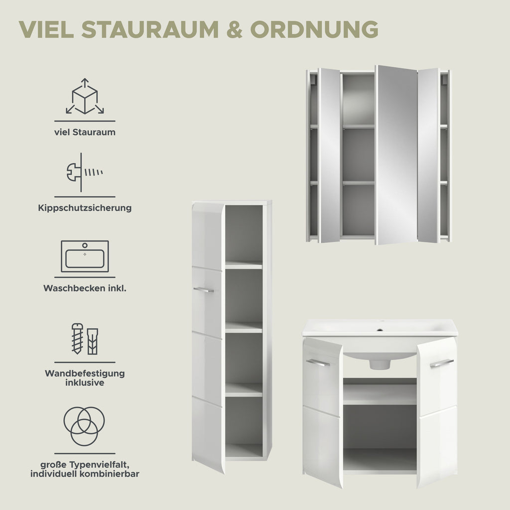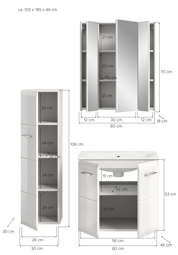 Verleihen Sie Ihrem Badezimmer mit unserer eleganten 3-teiligen Badkombination neuen Schwung! Diese durchdachte Kombination besteht aus einer praktischen Stauraumtype, einem modernen Waschtisch inklusive Waschbecken und einem stilvollen Spiegelschrank. Mit den kompakten Maßen von 105 x 185 x 46 cm und einem Typenabstand von 15 cm bietet diese Badkombination optimalen Stauraum für Ihre Badutensilien und sorgt gleichzeitig für eine aufgeräumte Atmosphäre. Die hochwertige MDF-Front mit moderner Rillenfräsung verleiht der Badkombination eine ansprechende Optik und sorgt für Langlebigkeit sowie einfache Pflege. Ideal für jedes Badezimmer, harmoniert diese Kombination perfekt mit verschiedenen Einrichtungsstilen und schafft einen einladenden Raum zum Entspannen. Machen Sie Ihr Badezimmer zum stilvollen Rückzugsort mit dieser praktischen Badkombination!
