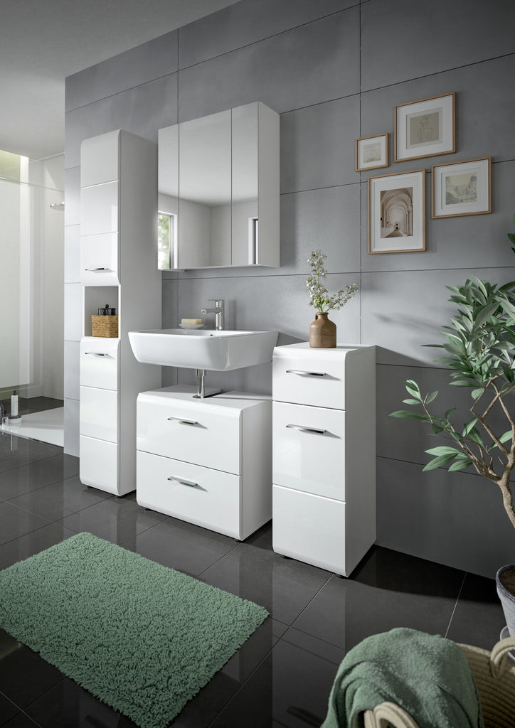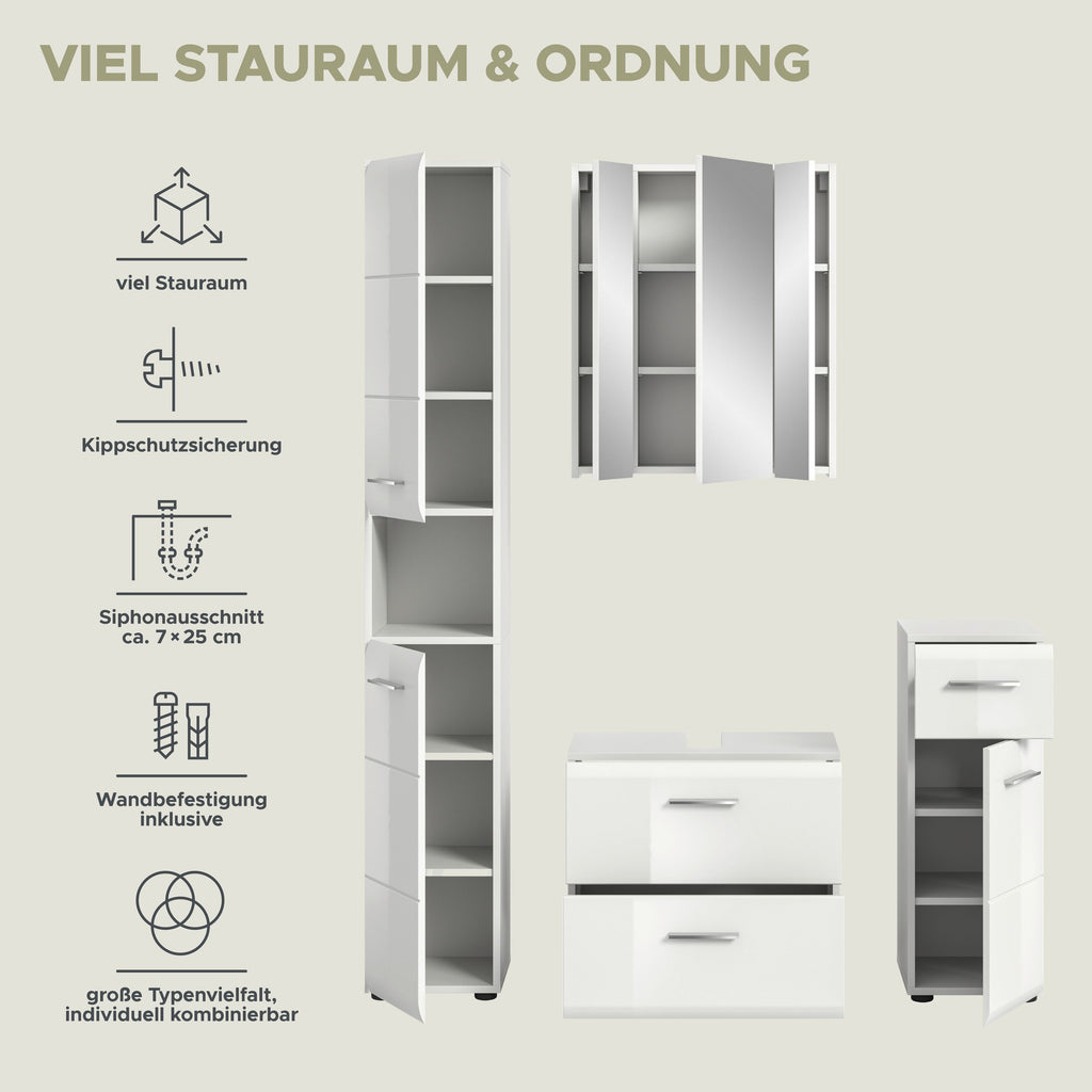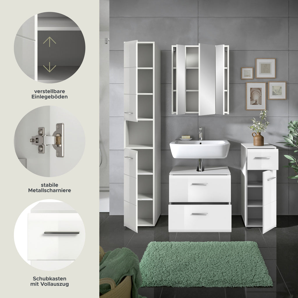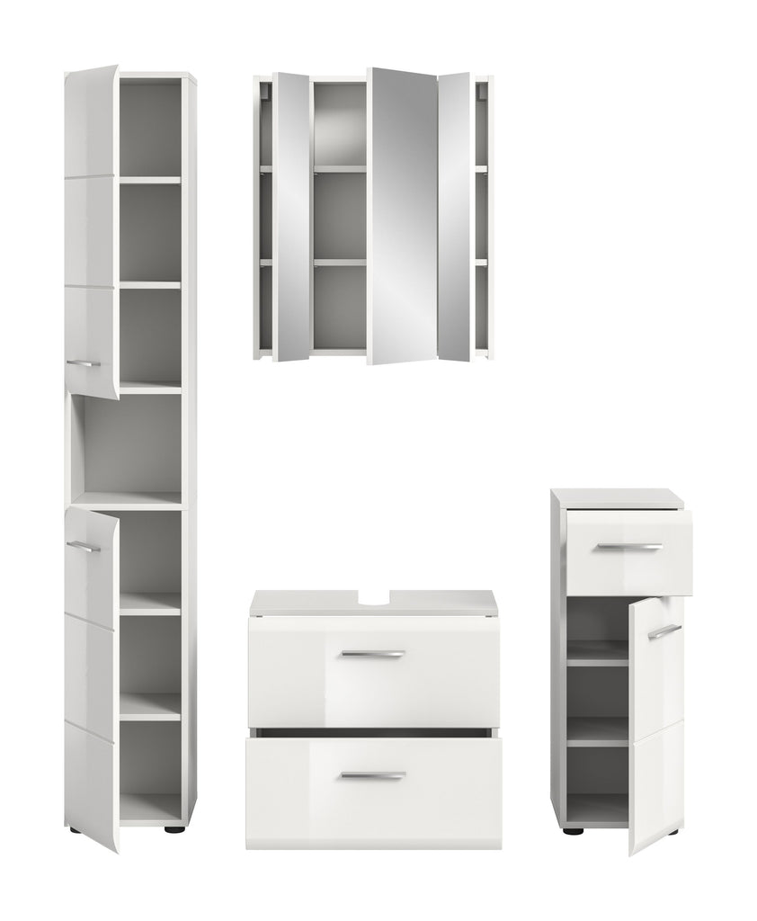 4-teilige Badkombination beteht aus 1x Hochschrank, 1x WBU, 1x Spiegelschrank, 1x Standschrank hoch