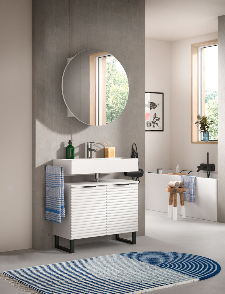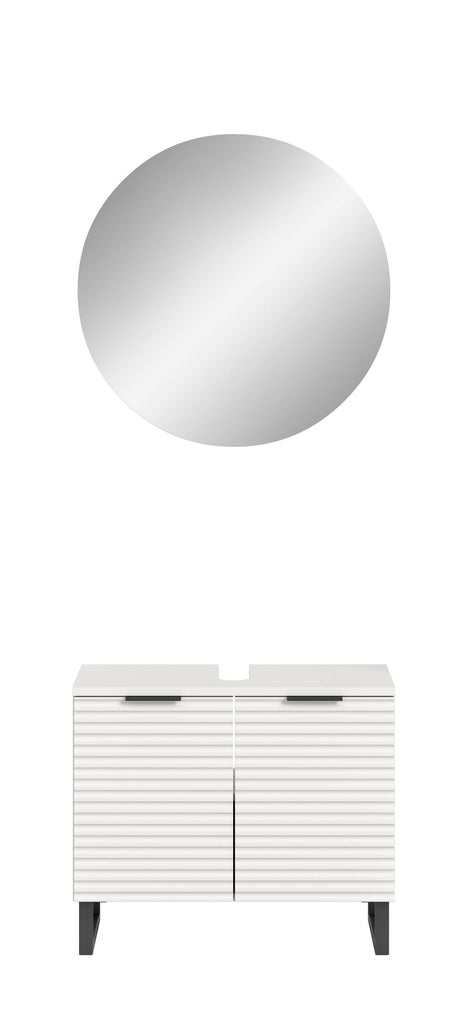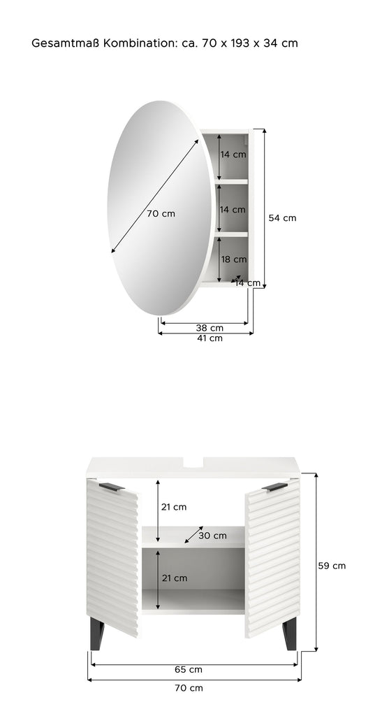 Diese elegante Badkombination in Weiß Nachbildung bringt modernes Design und maximalen Komfort in Ihr Badezimmer. Mit einer Gesamtgröße von 70 cm Breite, 193 cm Höhe und 34 cm Tiefe bietet sie eine perfekt abgestimmte Lösung für jeden Raum, der stilvollen Stauraum und eine harmonische Optik erfordert.Die Kombination umfasst hochwertige Badmöbel in zeitloser Rillenoptik, die dem Raum eine elegante Struktur verleihen. Die feinen Linien und das matte Weiß schaffen ein modernes, stilvolles Erscheinungsbild, das sich nahtlos in jede Badezimmergestaltung einfügt. Der stabile Kufenfuß verleiht den Möbeln nicht nur sicheren Halt, sondern sorgt auch für einen trendigen, schwebenden Look, der Leichtigkeit und Modernität ausstrahlt.Ein Highlight dieser Badkombination ist der runde Spiegelschrank mit indirekter Beleuchtung. Dieser verleiht Ihrem Badezimmer eine besondere Atmosphäre durch sein organisches Design und die sanfte, blendfreie Beleuchtung. Die integrierte Beleuchtung schafft ein angenehmes Licht für die tägliche Pflege und lässt das Bad in einem modernen, warmen Glanz erstrahlen. Gleichzeitig bietet der Spiegelschrank ausreichend Stauraum für Kosmetikartikel und Pflegeprodukte, sodass alles übersichtlich und griffbereit verstaut werden kann.Die funktionalen Elemente der Badkombination bieten reichlich Stauraum, während die hochwertige Verarbeitung und die pflegeleichten Oberflächen für Langlebigkeit und Komfort im Alltag sorgen. Ob Handtücher, Pflegeprodukte oder Reinigungsmittel – in den großzügigen Schränken findet alles seinen Platz.Wenn Sie auf der Suche nach einer stilvollen und funktionalen Badlösung sind, die Design, Komfort und Qualität vereint, ist diese Badkombination in Weiß Nachbildung mit Rillenoptik, Kufenfuß und rundem Spiegelschrank mit indirekter Beleuchtung die ideale Wahl für Ihr modernes Badezimmer.