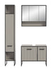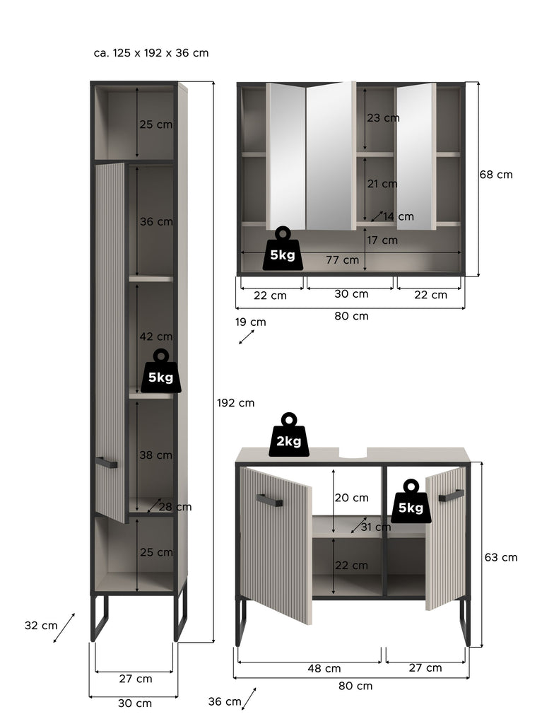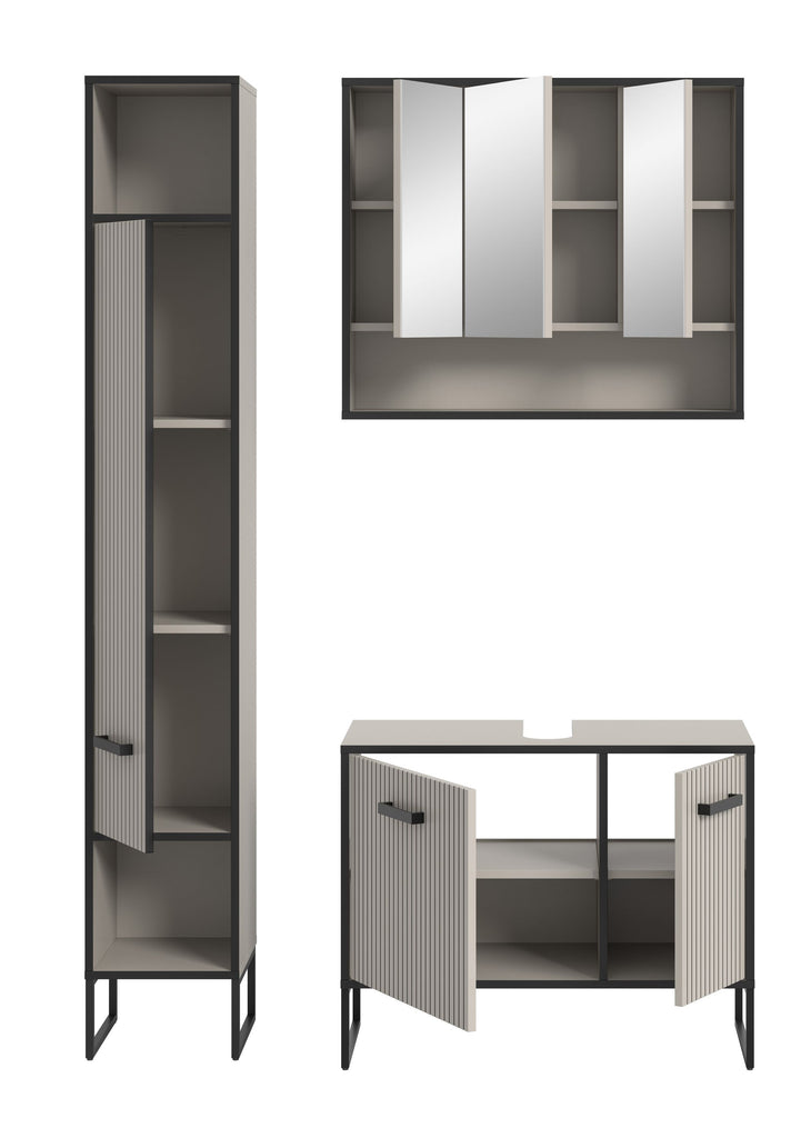 Die 3-teilige Badkombination (B/H/T: 125x192x36 cm) in Kaschmir Nachbildung bietet funktionales Design in modernem Gewand. Mit einem Hochschrank, Waschbeckenunterschrank und Spiegelschrank ausgestattet, sorgt dieses Set für ausreichend Stauraum und Ordnung in Ihrem Badezimmer. Ihre pflegeleichte Oberfläche garantiert einfache Reinigung, während die Rillenoptik für zeitgemäßen Stil steht. Perfekt für all jene, die ein kompaktes, elegantes Bad wünschen!