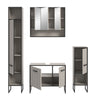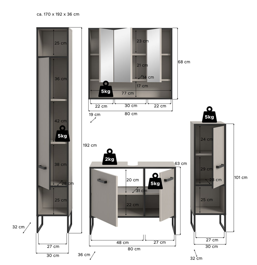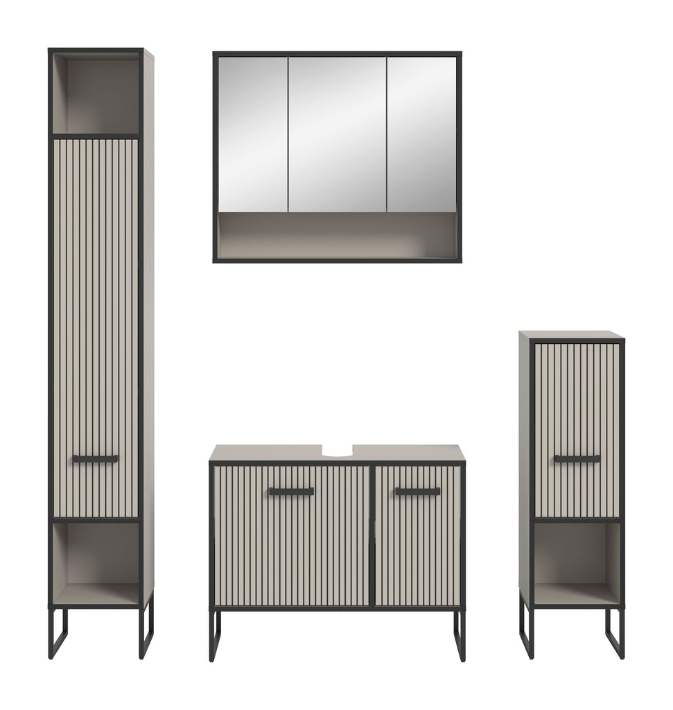 Verleihen Sie Ihrem Badezimmer mit der 4-teiligen Badkombination (B/H/T: 170x192x36 cm) in Kaschmir Nachbildung eine luxuriöse Note. Dieses umfassende Set beinhaltet einen Hochschrank, Waschbeckenunterschrank, Spiegelschrank und einen Standschrank, die zusammen ein maximales Stauraumangebot bieten. Die hochwertig verarbeitete, pflegeleichte Oberfläche und die trendige Rillenoptik schaffen ein elegantes und einladendes Ambiente. Ideal für großzügigere Badezimmer!