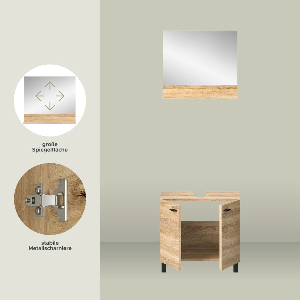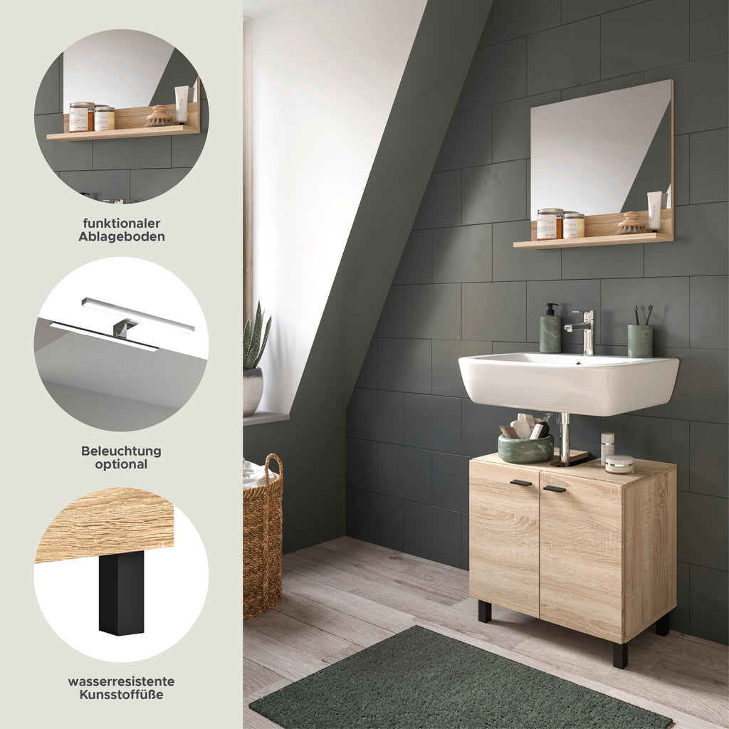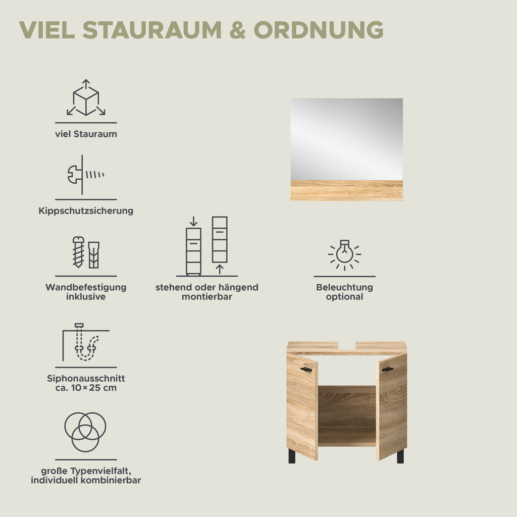 Unsere Badkombination in Eiche Sonoma Nachbildung bietet maximale Flexibilität, um Ihr Badezimmer nach Ihren individuellen Vorstellungen zu gestalten. Das zeitlose Design fügt sich harmonisch in jedes Badezimmer ein und verleiht ihm eine warme und natürliche Atmosphäre. Erforschen Sie jetzt diese vielseitige Lösung für Ihr Badezimmer.