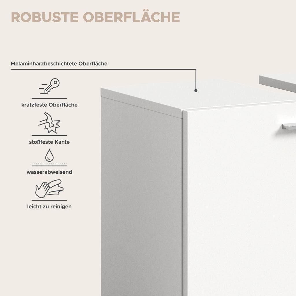 Design/Stil: Schlichte und moderne Badkombination in strahlendem Weiß für ein helles und zeitgemäßes Erscheinungsbild im Badezimmer.
