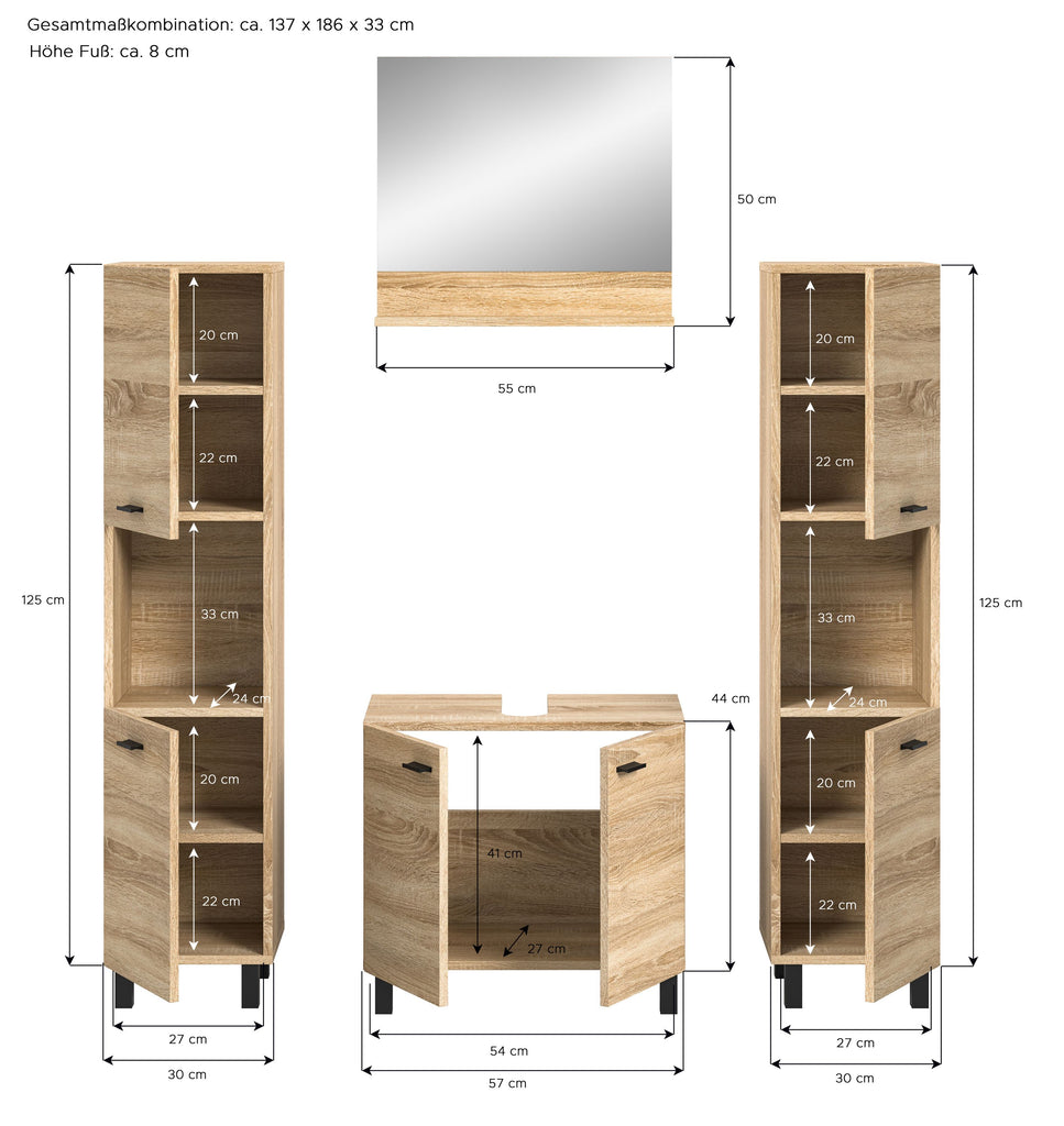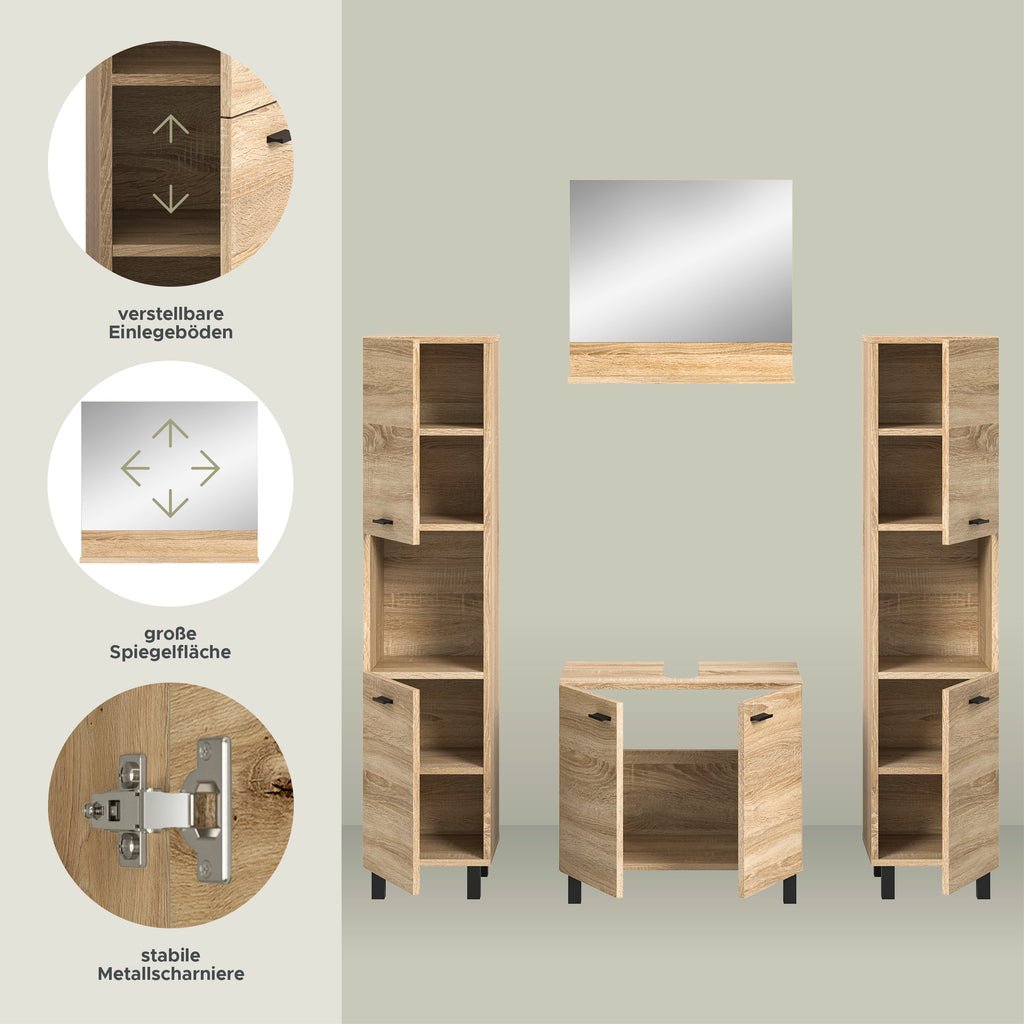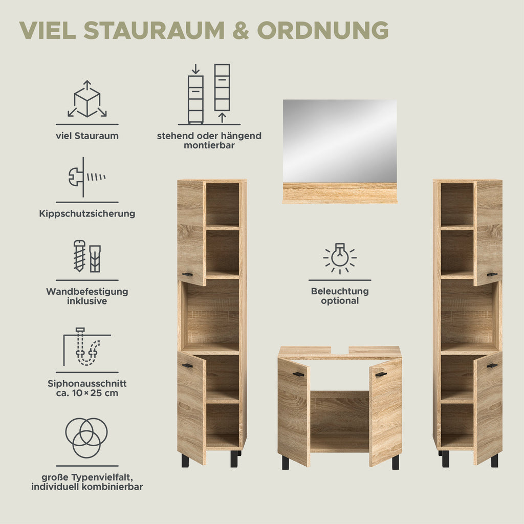 Unsere Badkombination in Eiche Sonoma Nachbildung bietet maximale Flexibilität, um Ihr Badezimmer nach Ihren individuellen Vorstellungen zu gestalten. Das zeitlose Design fügt sich harmonisch in jedes Badezimmer ein und verleiht ihm eine warme und natürliche Atmosphäre. Erforschen Sie jetzt diese vielseitige Lösung für Ihr Badezimmer.