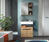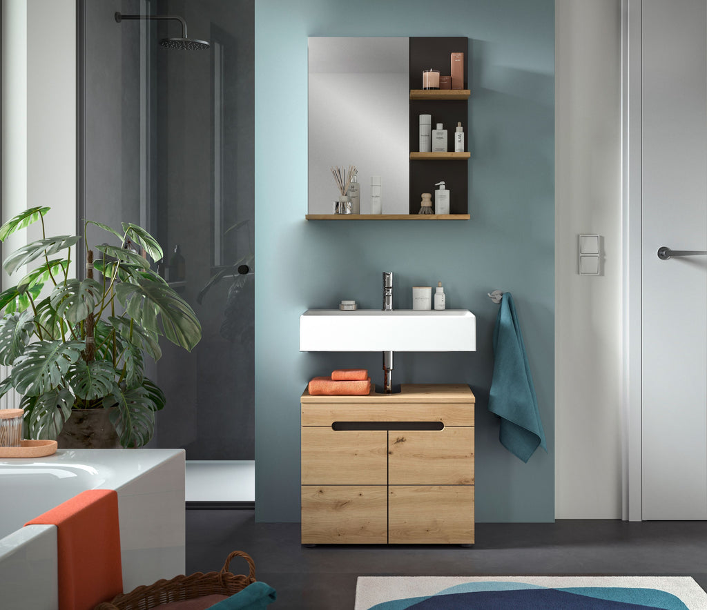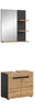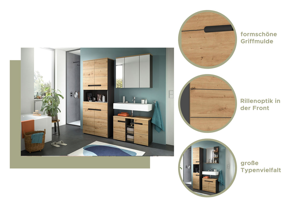 Die Badkombination (B/H/T: 63x193x34 cm) ist die perfekte Wahl für moderne Badezimmer, die Funktionalität und Ästhetik vereinen möchten. Die Kombination aus Basalt Grau Nachbildung und Artisan Nachbildung mit natürlicher Holzoptik und schwarzen Akzenten verleiht den Möbelstücken einen eleganten und zeitlosen Charakter. Alle Elemente der Badkombination – vom Hochschrank bis zum Waschtischunterschrank – sind optisch aufeinander abgestimmt und sorgen für ein harmonisches und einheitliches Erscheinungsbild. Die Möbel bieten vielseitige Stauraumlösungen, die sowohl praktisch als auch platzsparend sind. Gefertigt aus FSC®-zertifiziertem Holzwerkstoff, trägt diese Badkombination zum Schutz der Wälder bei und steht für nachhaltige Qualität. Diese Badmöbel-Kombination ist ideal, um Ihr Badezimmer stilvoll und funktional zu gestalten und gleichzeitig einen Beitrag zur Umwelt zu leisten.