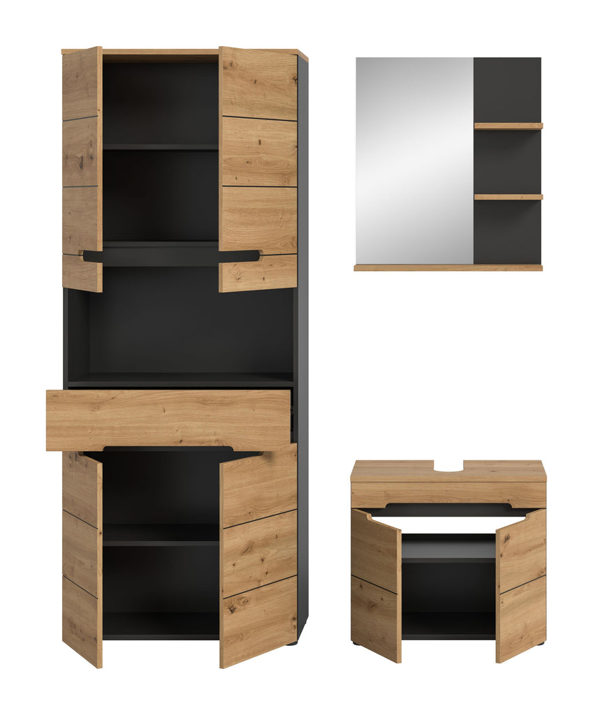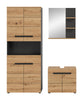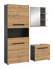 Die Badkombination (B/H/T: 154x193x34 cm) ist die perfekte Wahl für moderne Badezimmer, die Funktionalität und Ästhetik vereinen möchten. Die Kombination aus Basalt Grau Nachbildung und Artisan Nachbildung mit natürlicher Holzoptik und schwarzen Akzenten verleiht den Möbelstücken einen eleganten und zeitlosen Charakter. Alle Elemente der Badkombination – vom Hochschrank bis zum Waschtischunterschrank – sind optisch aufeinander abgestimmt und sorgen für ein harmonisches und einheitliches Erscheinungsbild. Die Möbel bieten vielseitige Stauraumlösungen, die sowohl praktisch als auch platzsparend sind. Gefertigt aus FSC®-zertifiziertem Holzwerkstoff, trägt diese Badkombination zum Schutz der Wälder bei und steht für nachhaltige Qualität. Diese Badmöbel-Kombination ist ideal, um Ihr Badezimmer stilvoll und funktional zu gestalten und gleichzeitig einen Beitrag zur Umwelt zu leisten.
