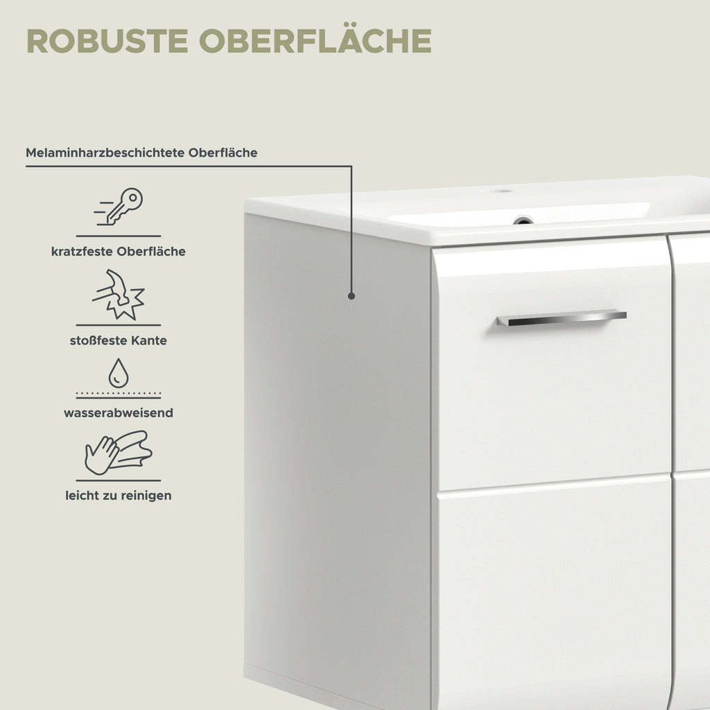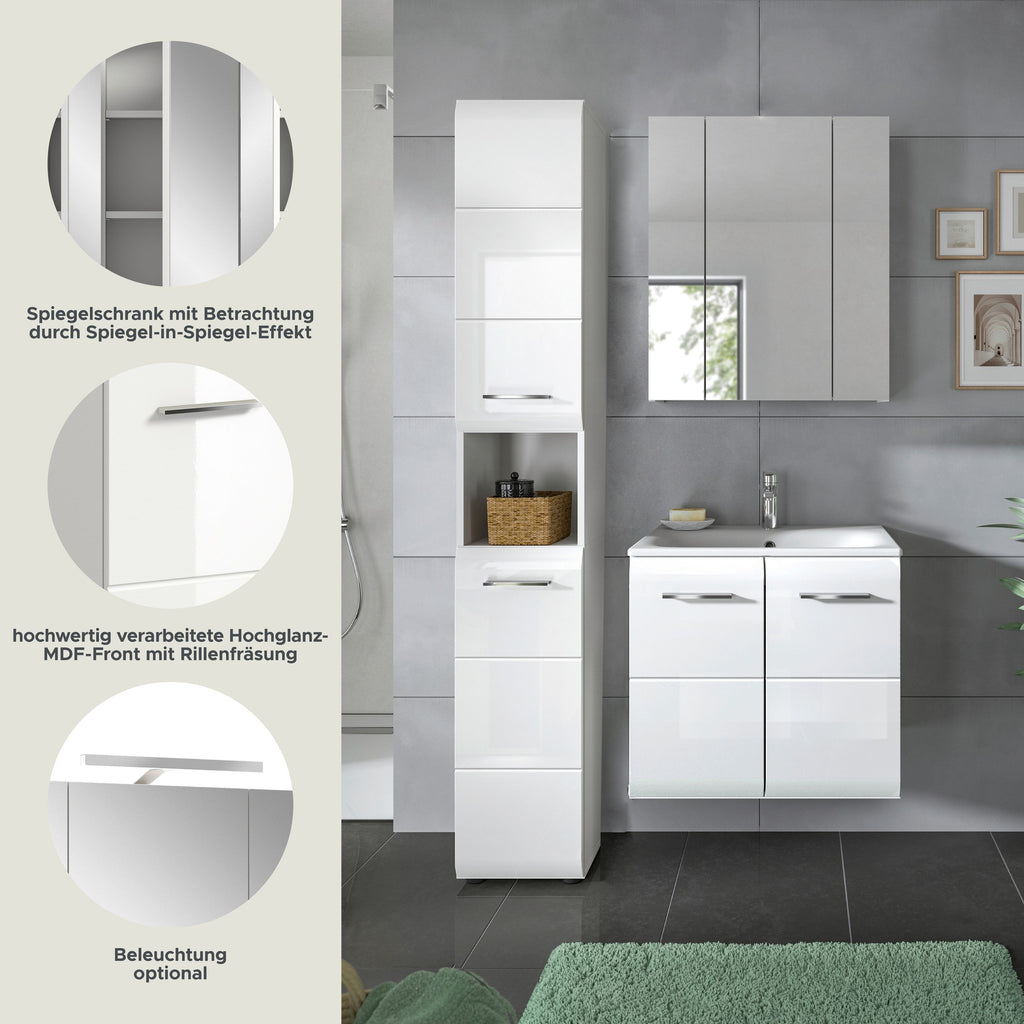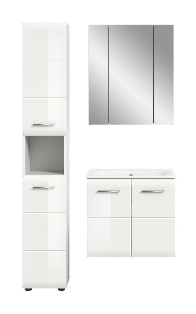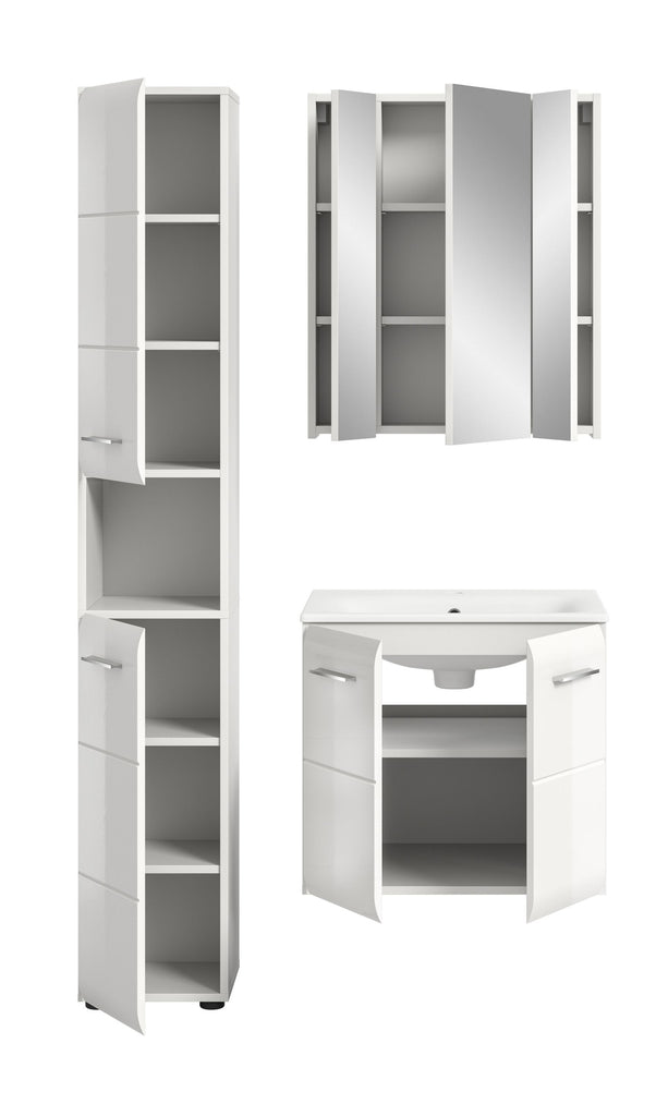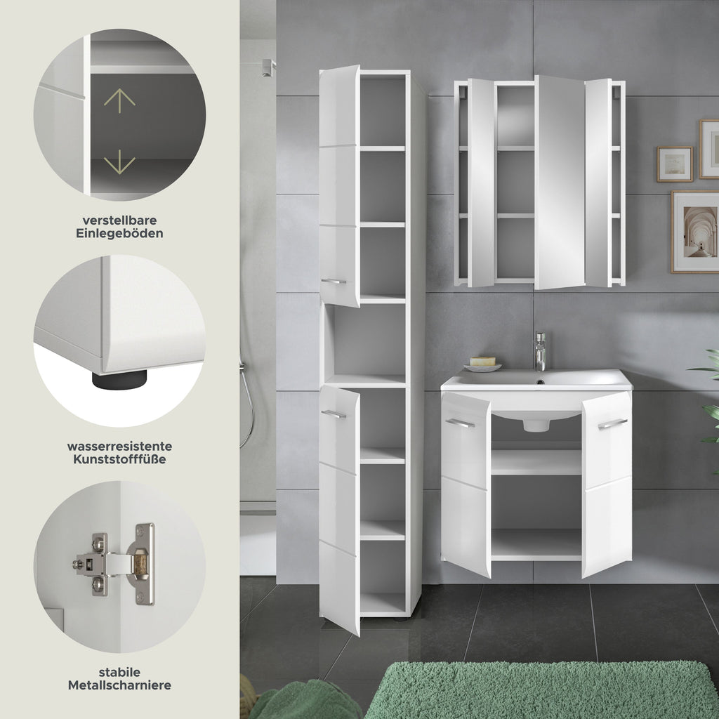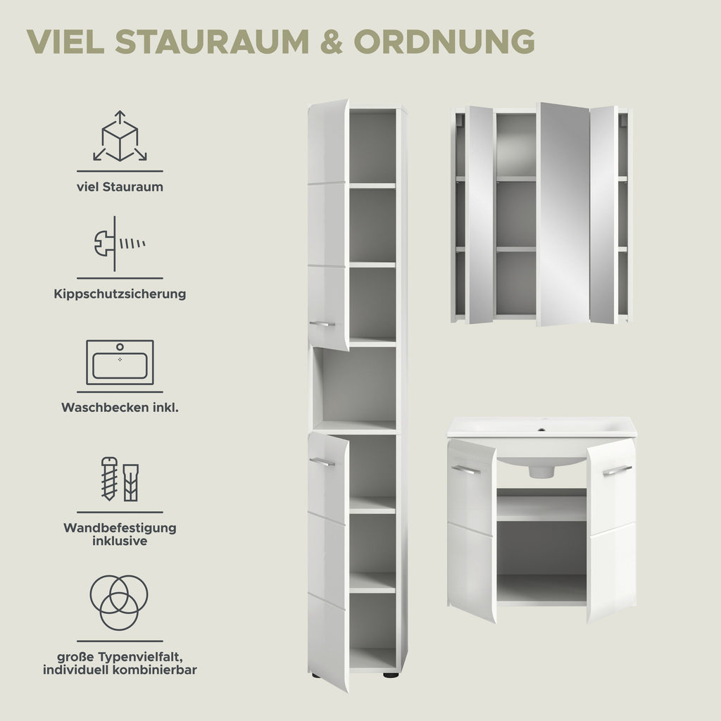 4-teilige Badkombination beteht aus 1x Hochschrank, 1x Waschtisch inkl. Waschbecken, 1x Spiegelschrank