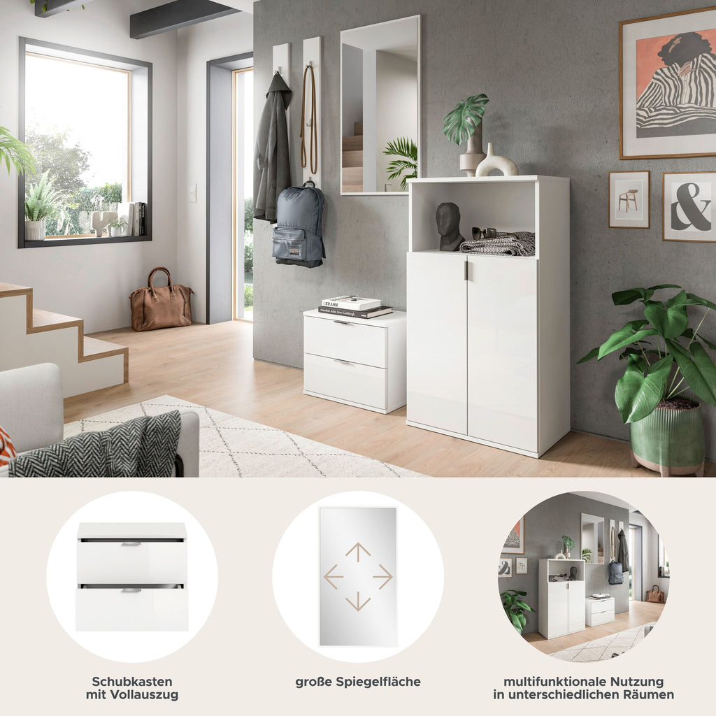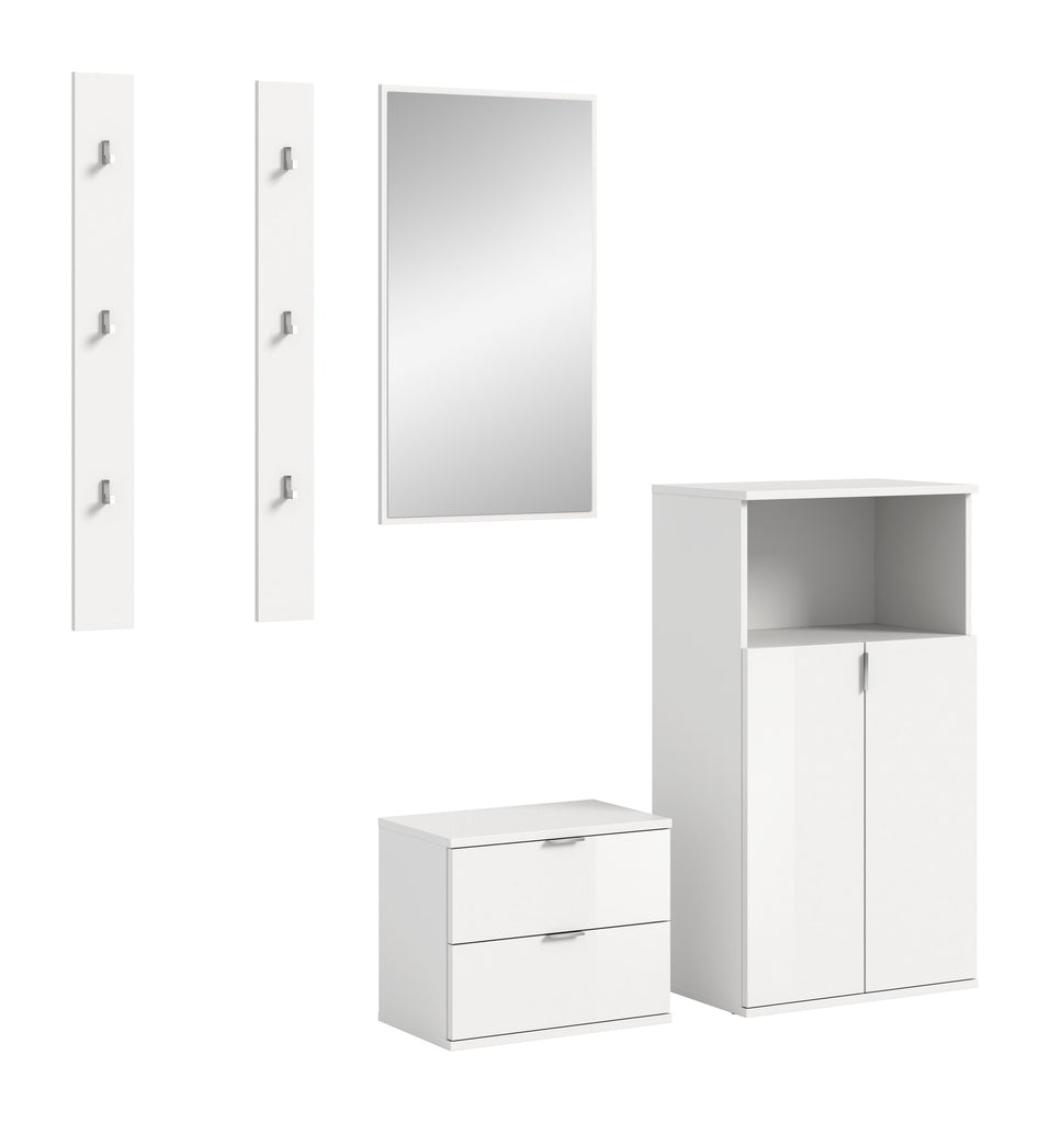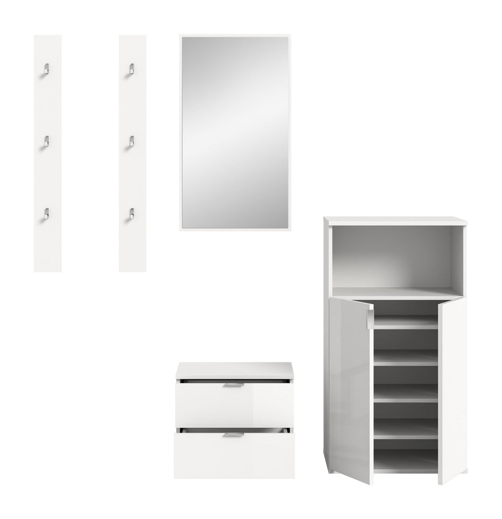 Verleihen Sie Ihrem Eingangsbereich mit unserer Garderobenkombination in Weiß Hochglanz einen modernen Look! Mit den Abmessungen von 179 cm Breite, 191 cm Höhe und 37 cm Tiefe bietet dieses Set praktische Lösungen für jeden Flur. Es beinhaltet ein 2er Set Paneel für eine einfache Jackenaufbewahrung, eine bequeme Sitzbank/Kommode, einen eleganten Spiegel und eine geräumige Schuhkommode. Dieser durchdachte Mix kombiniert Stil mit Funktionalität und schafft Ordnung in Ihrem Zuhause. Die Hochglanzoberfläche reflektiert Licht und lässt Ihren Flur heller erscheinen. Ideal für Familien und modernes Wohnen!