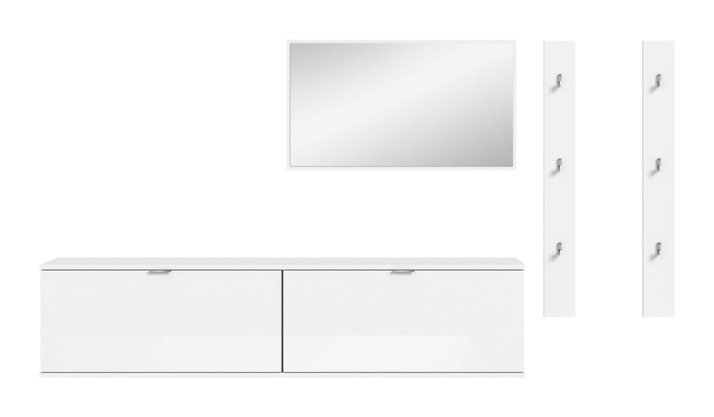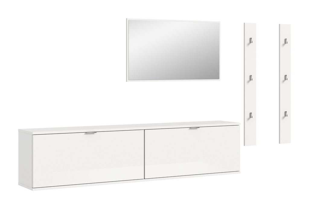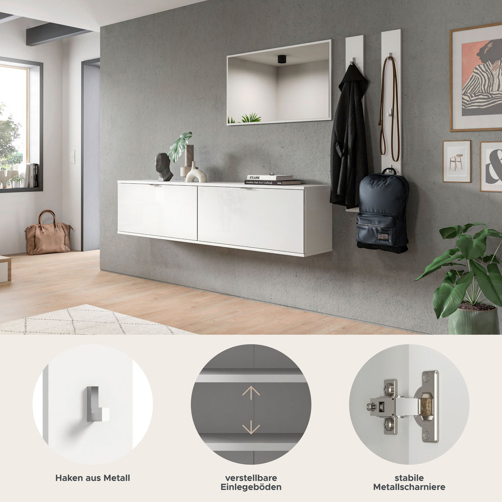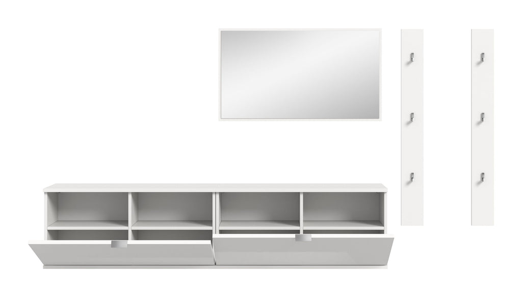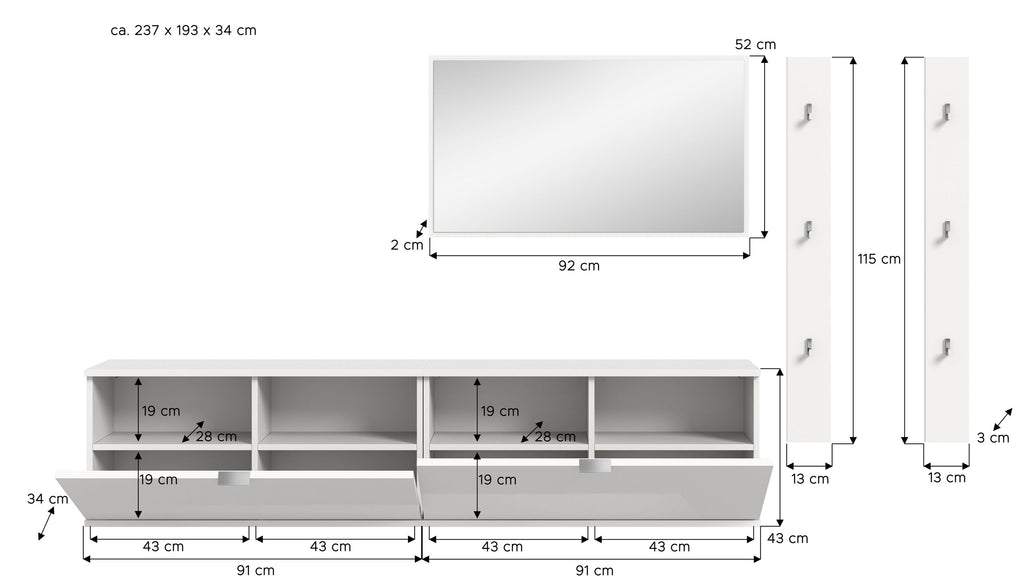 Entdecken Sie unsere elegante Garderobenkombination in strahlendem Weiß hochglanz, ideal für jeden Eingangsbereich! Mit großzügigen Abmessungen von 237 cm Breite, 191 cm Höhe und 37 cm Tiefe bietet dieses Set nicht nur praktische Funktionen, sondern verleiht Ihrem Flur auch einen modernen Look. Die Kombination besteht aus zwei stilvollen Sitzbänken/Kommoden, die ausreichend Stauraum für Schuhwerk und Accessoires bieten. Der große Spiegel sorgt für eine perfekte Vorbereitung vor dem Verlassen Ihres Zuhauses und lässt den Raum gleichzeitig größer erscheinen. Das praktische Paneel im 2er Set ergänzt die Garderobe sinnvoll, sodass Jacken und Taschen direkt griffbereit sind. Dank der Hochglanz-Oberfläche wird Licht reflektiert, was jeden Raum heller und einladender macht. Diese Garderobenkombination ist nicht nur funktional, sondern auch ein echter Hingucker. Gestalten Sie Ihren Eingangsbereich mit Stil und Funktionalität – ideal für Familien und moderne Wohnkonzepte. Nutzen Sie die Vorteile dieser durchdachten Garderobenkombination und genießen Sie Ordnung und Eleganz in Ihrem Zuhause!