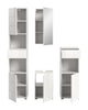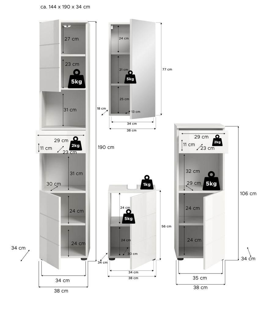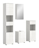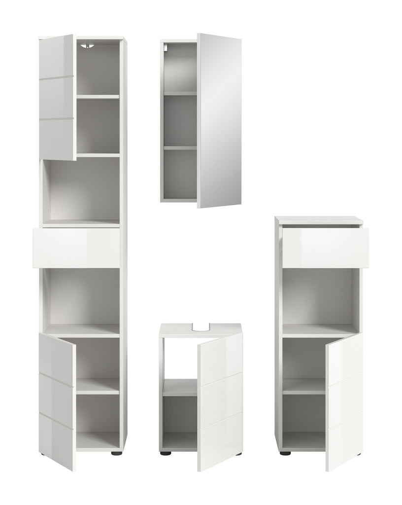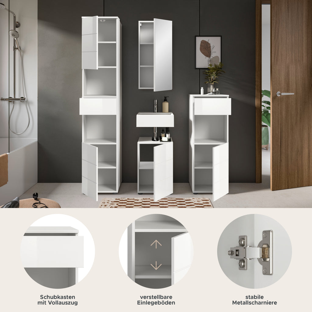 Unsere Badkombination (B/H/T: 144x190x34 cm) in weiß hochglänzender Tiefzieh-Optik vereint Stil und Funktionalität! Mit einem Hochschrank, einem Waschbeckenunterschrank, einem Spiegelschrank und einem schmalen Badschrank bietet dieses Set umfassenden Stauraum und eine moderne Ästhetik. Perfekt für jedes Badezimmer, sorgt diese Kombination für Ordnung und ein einladendes Ambiente. Erleben Sie die perfekte Balance aus Design und Praxistauglichkeit!