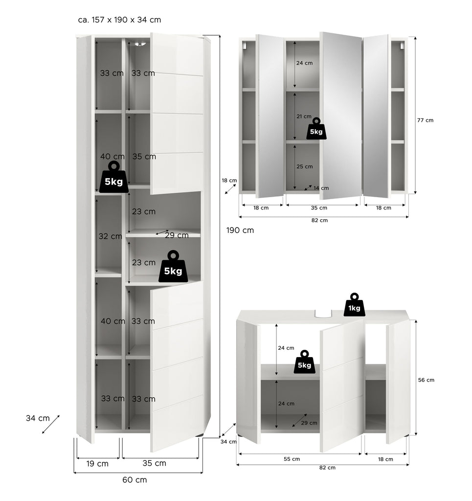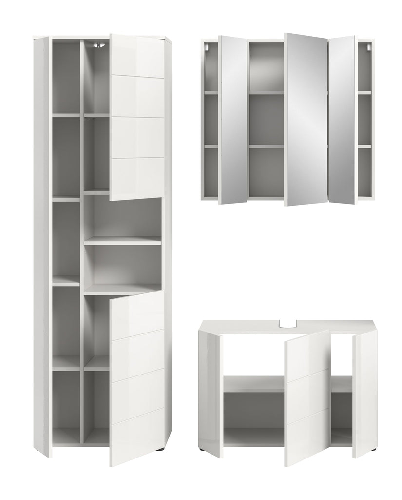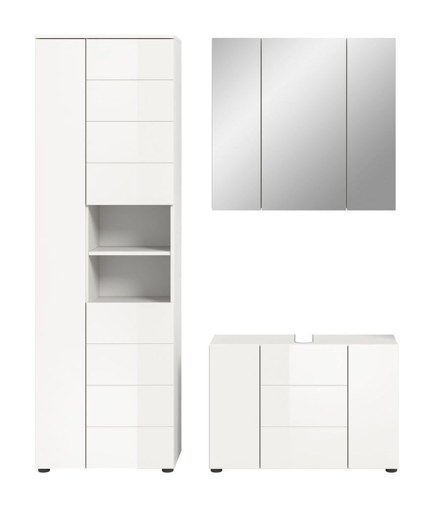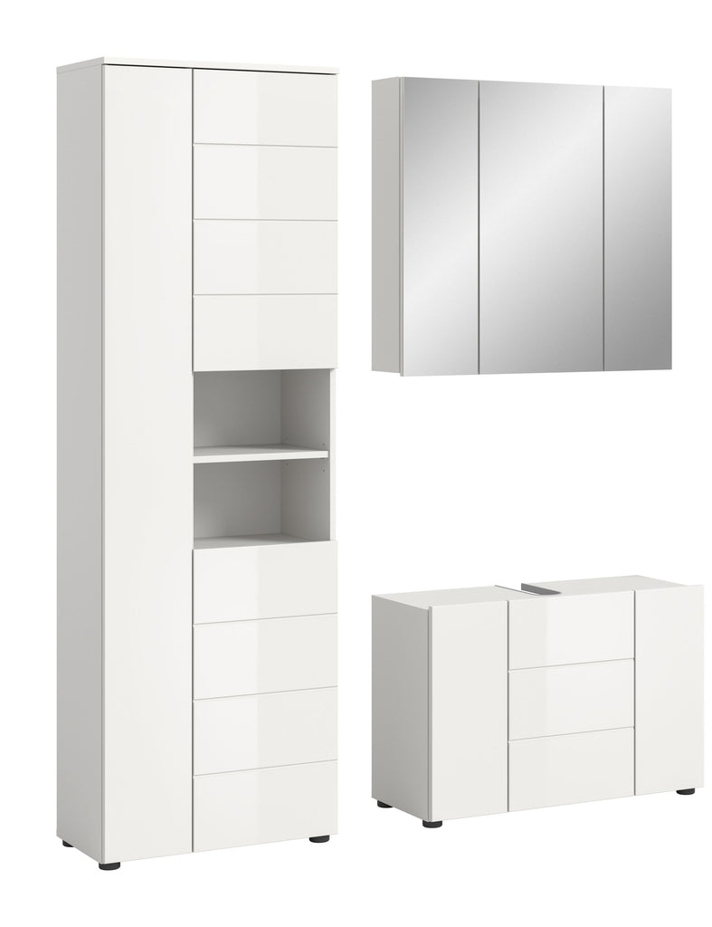 Die Badkombination (B/H/T: 157x190x34 cm) in weiß hochglänzender Tiefzieh-Optik bringt Stil und Funktionalität in Ihr Badezimmer. Dieses Set umfasst einen Hochschrank, einen Waschbeckenunterschrank und einen Spiegelschrank, die zusammen eine praktische Lagerungslösung bieten. Genießen Sie den modernen Look und den zusätzlichen Stauraum in Ihrem Bad und schaffen Sie einen aufgeräumten, einladenden Raum!