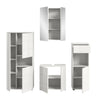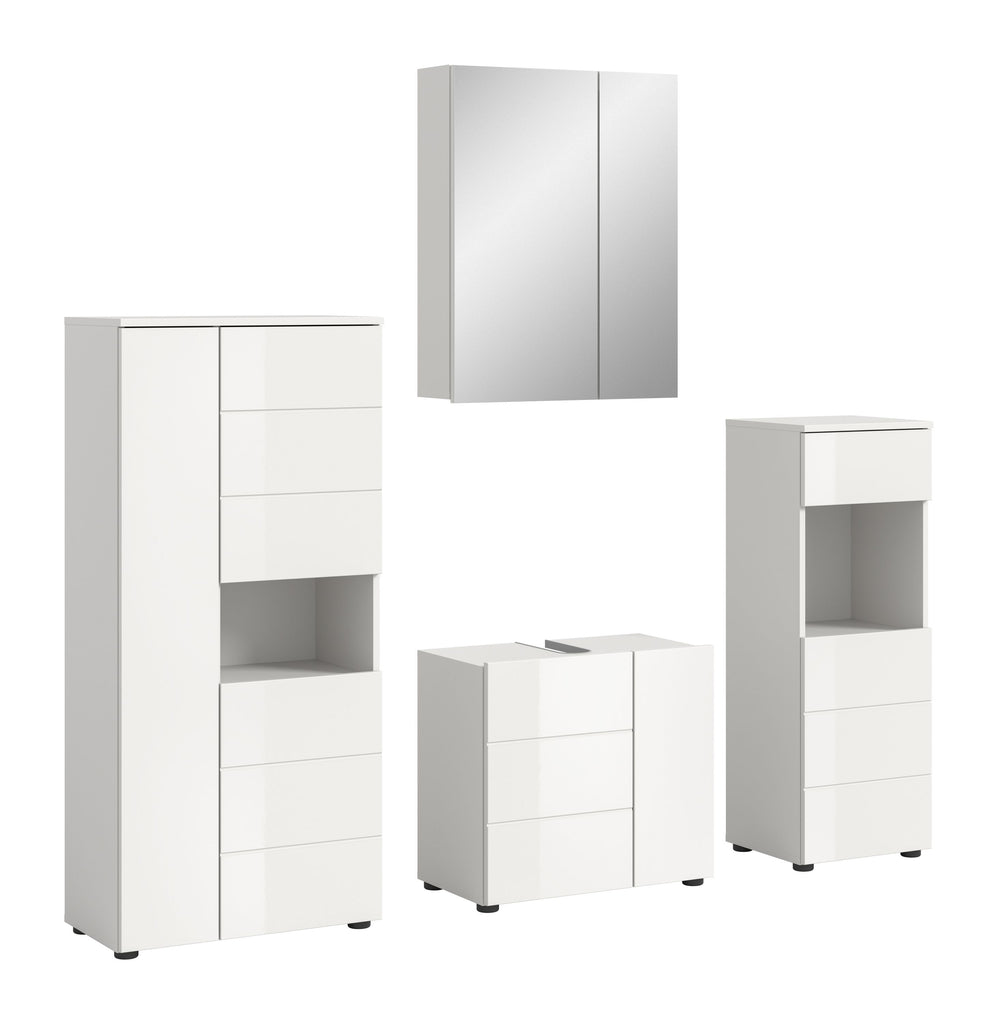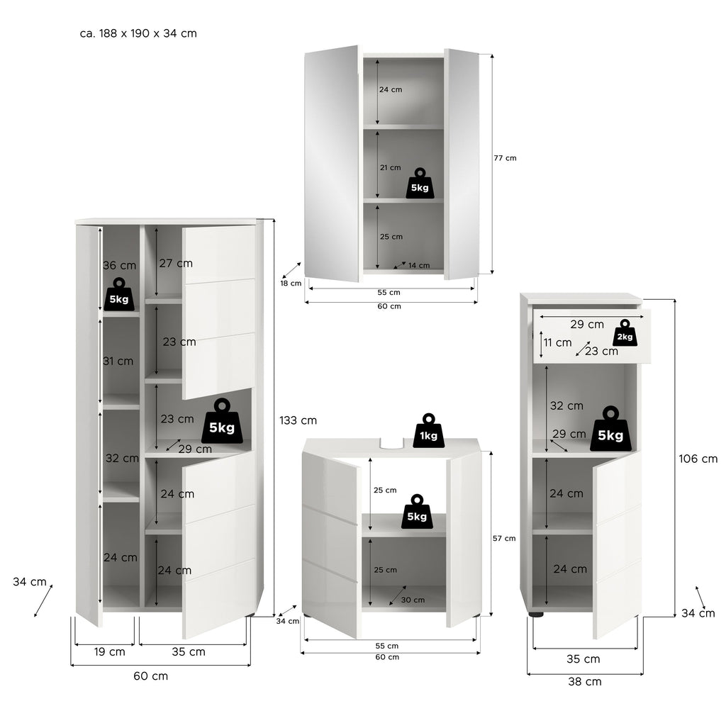 Die Badkombination (B/H/T: 188x190x34 cm) in elegantem weiß hochglänzenden Tiefzieh-Design bietet umfassenden Stauraum für Ihr Badezimmer. Dieses Set beinhaltet einen breiten Badschrank, einen Waschbeckenunterschrank, einen Spiegelschrank und einen schmalen Badschrank, um Ihren Raum ordentlich und organisiert zu halten. Die moderne Gestaltung schafft eine einladende Atmosphäre in Ihrem Bad. Verleihen Sie Ihrer Badeoase neuen Glanz mit dieser stilvollen Badkombination!