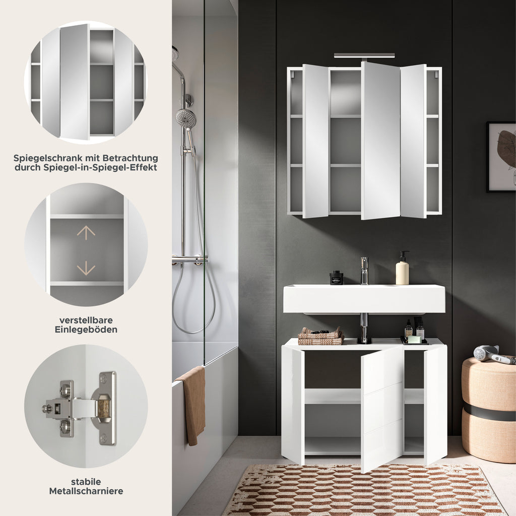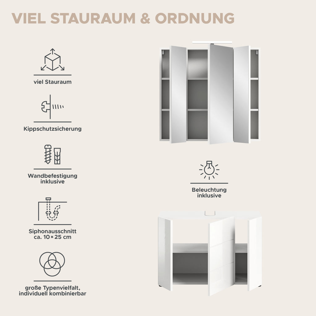 Erweitere dein Badezimmer mit unserer stylischen Badkombination aus einem Waschbeckenunterschrank und einem Spiegelschrank in weißem Melamin und weißem Hochglanz. Diese moderne Kombination vereint Funktionalität und Eleganz, bietet ausreichend Stauraum und verleiht deinem Bad eine frische Atmosphäre. Genieße die praktische Nutzung und das ansprechende Design dieser hochwertigen Möbelstücke für dein Zuhause.