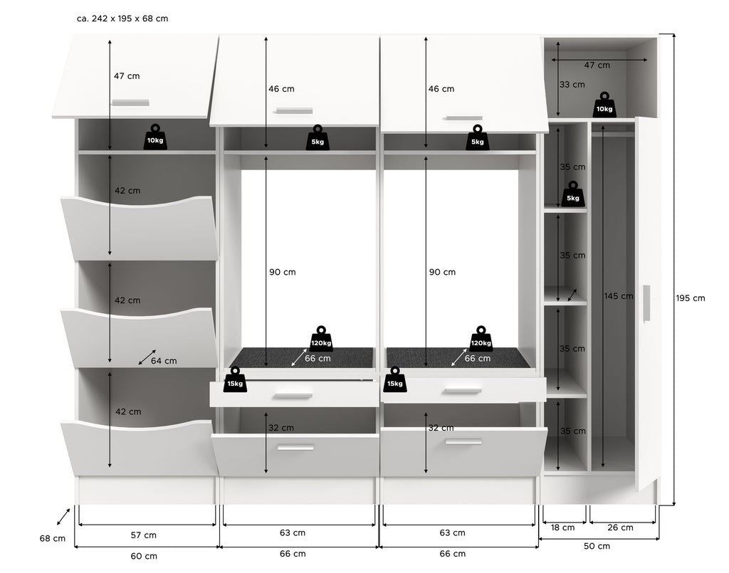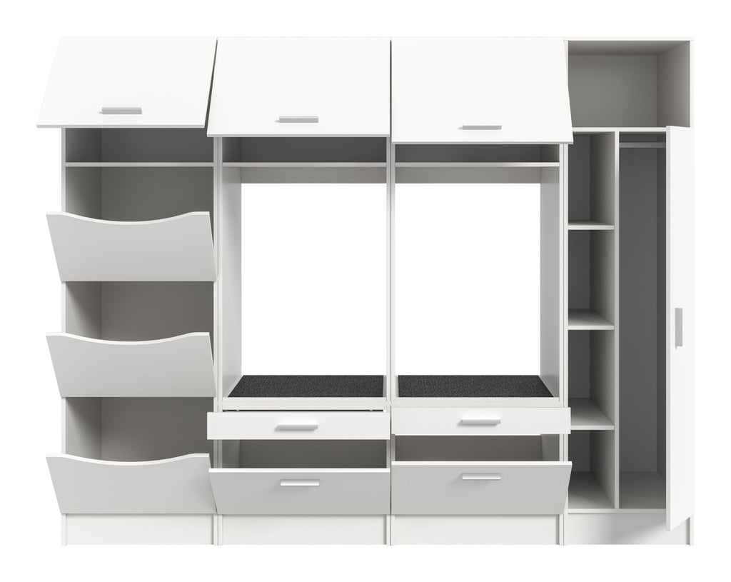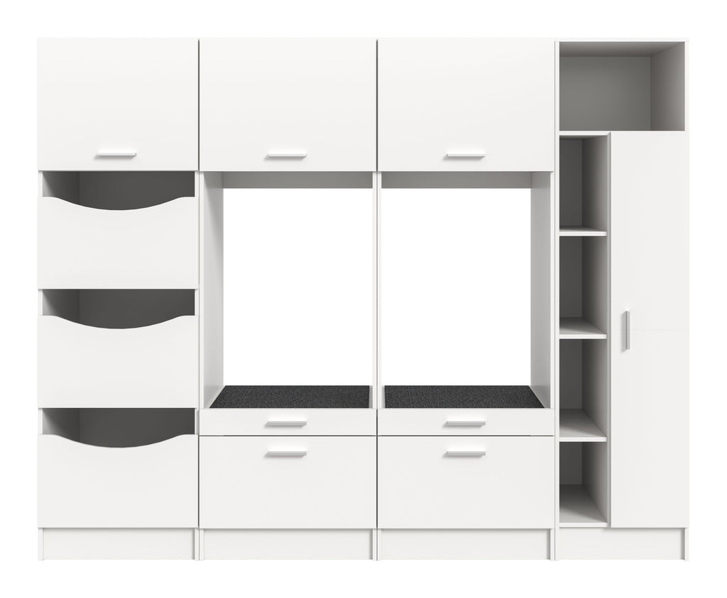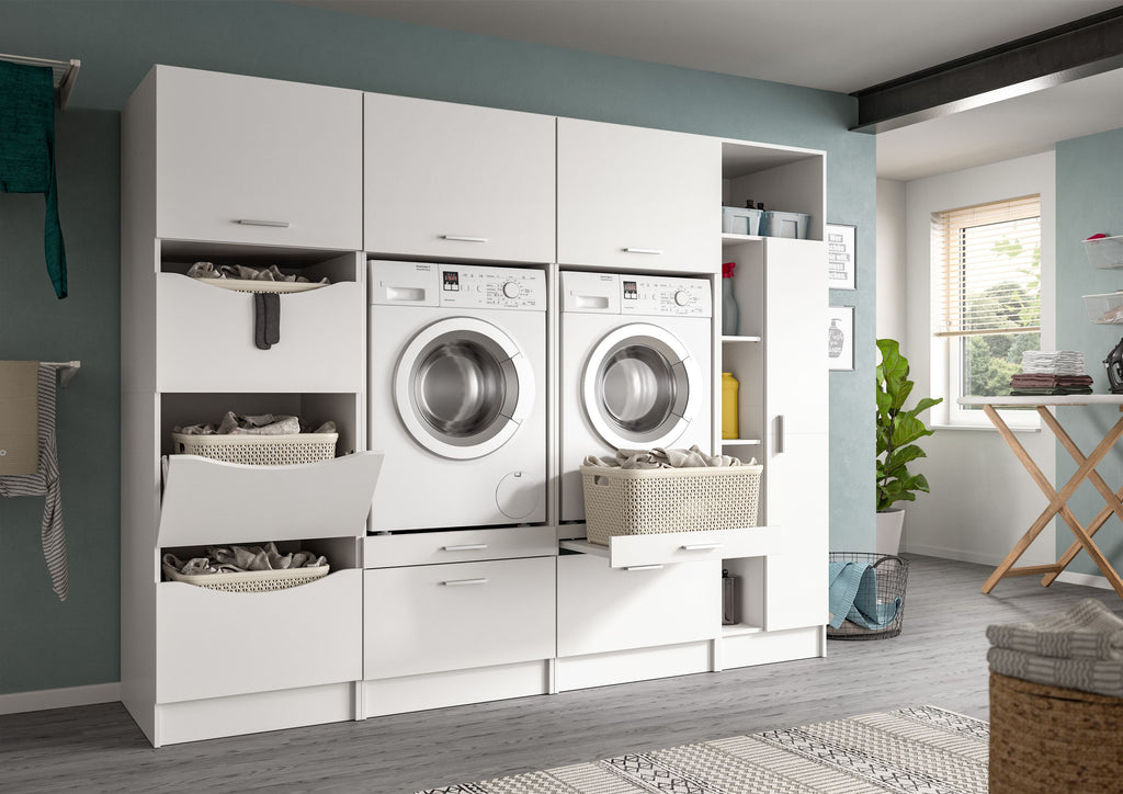 Die Waschmaschinenumbau Set (B/H/T: 233x195x68 cm) in weiß Nachbildung ist die perfekte Lösung für größere Waschräume! Mit einem Wäscheschrank, zwei Waschmaschinenschränken und einem Universalschrank bietet dieses 4-teilige Set umfassenden Stauraum und organisiert Ihre Wäscheutensilien spielend leicht. Die elegante, moderne Optik fügt sich harmonisch in jede Waschküche ein und schafft eine einladende Atmosphäre. Machen Sie Ordnung in Ihrem Raum mit dieser stilvollen und funktionalen Lösung! Praktische Ergänzung für jeden Hauswirtschaftsraum.